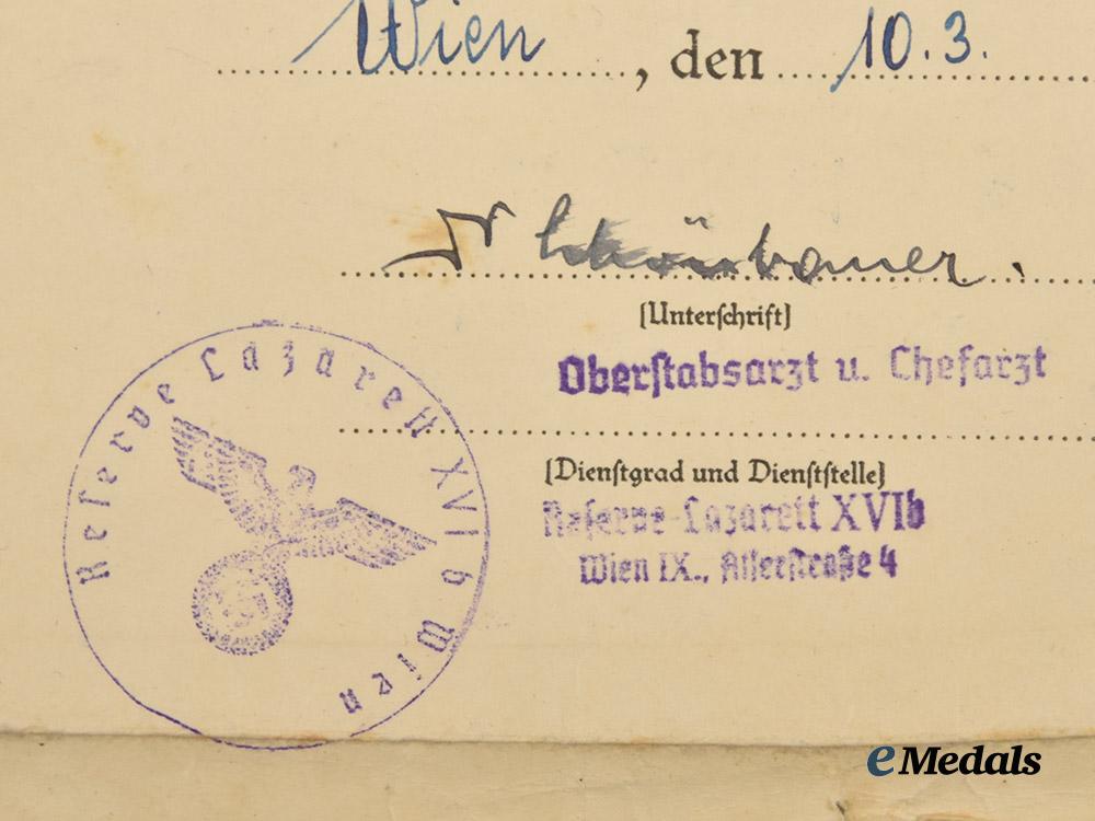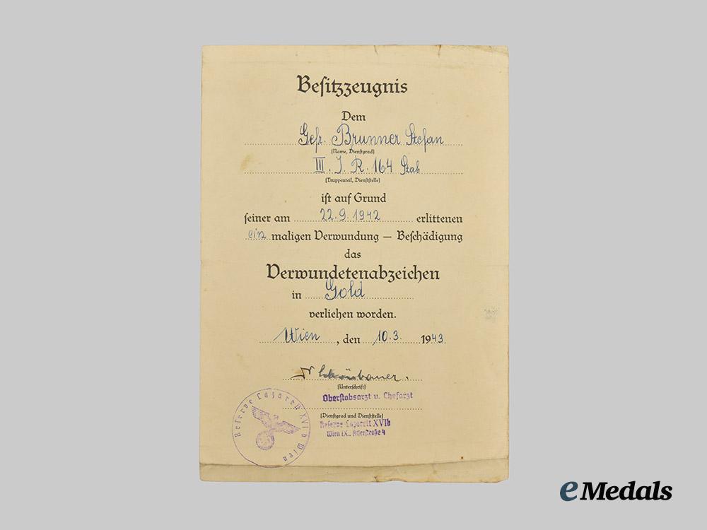 3. An award document for a Gold Grade Wound Badge, named to Brunner as a Gefreiter of Infanterie-Regiment 164, awarded in Vienna on 10 March 1943 for a single wound suffered on 22 September 1942, certified by the handwritten signature of an unidentified Oberstabsarzt and Chefarzt of Reserve-Lazarett XVIb, measuring 14 cm (w) x 20 cm (h), demonstrating material fatigue throughout, in very fine condition.