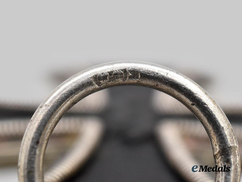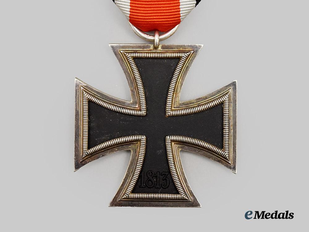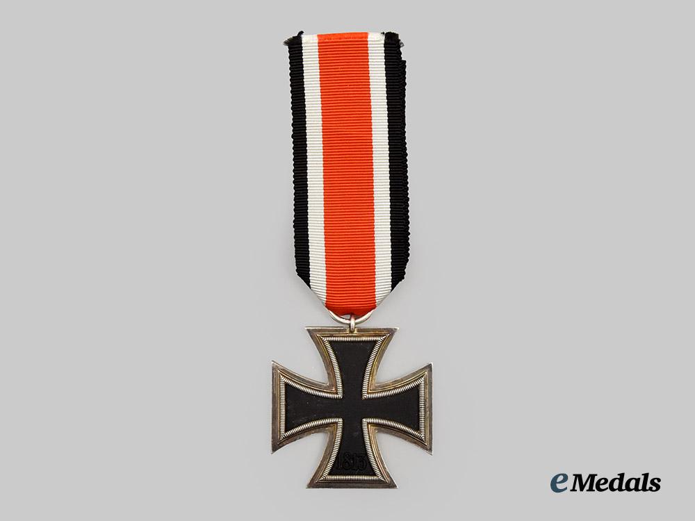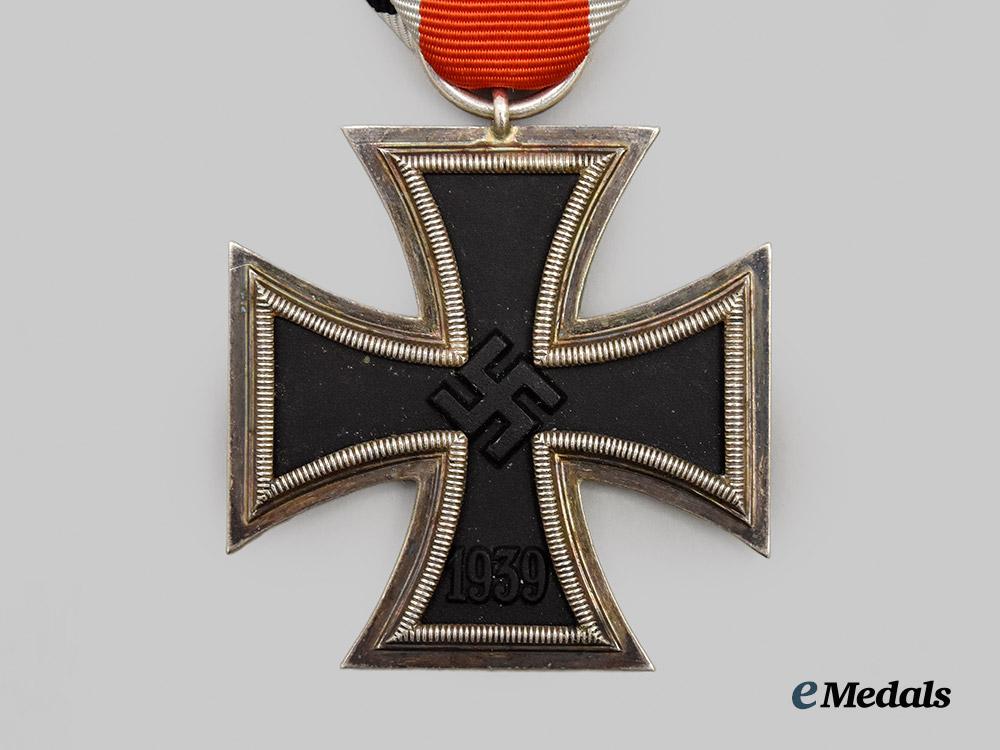 1. A 1939 Iron Cross II Class, constructed of iron and silver, on loop for suspension from its period original ribbon, consisting of a Cross Pattée with a blackened magnetic iron core within a ribbed silver frame, the obverse with a central mobile swastika, the six o’clock arm with a reinstitution date of “1939”, the reverse six o’clock arm with an initial institution date of “1813”, the suspension loop stamped with an illegible Präsidialkanzlei code, measuring 44.11 mm (w) x 47.82 mm (h), weighing 20.4 grams, in extremely fine condition.