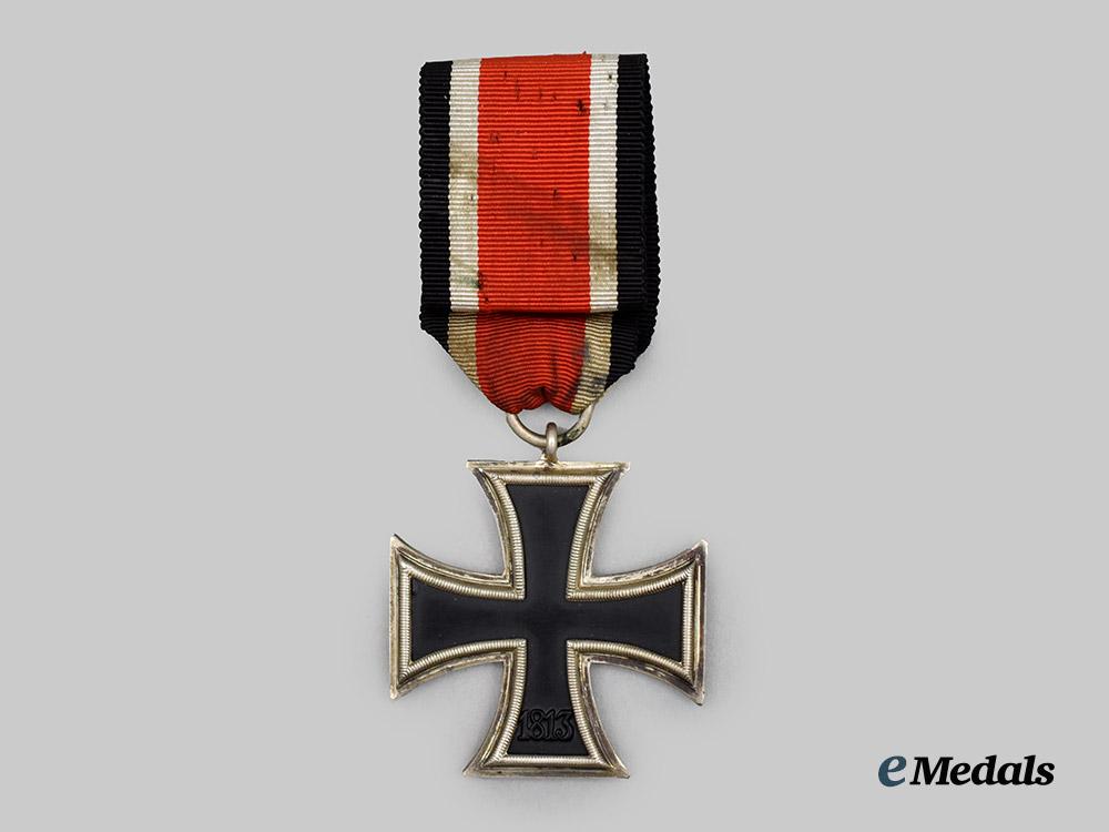 (Eisernes Kreuz 1939 II. Klasse). Reinstituted 1 September 1939. (1939-1945 issue). A textbook example of a Schinkel-Form Lug Iron Cross 1939 Second Class. Constructed of iron and silver, on loop for suspension from its full size period original ribbon, consisting of a Cross Pattée with blackened magnetic iron core within a ribbed silver frame, the obverse with central mobile swastika, the six o’clock arm with a reinstitution date of “1939”, the reverse six o’clock arm with an initial institution date of “1813”, unmarked but demonstrating the clear characteristics of a Schinkel-form lug variant, measuring 42.7 mm (w) x 43.0 mm (h), weighing 19.38 grams, with attractive patia from age, in better than very fine condition.