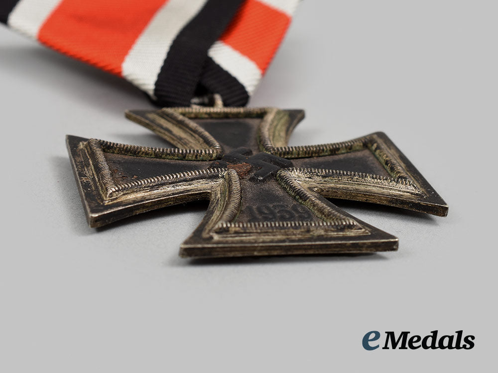 1. A 1939 award, constructed of iron and silver, on loop for suspension from its period tri-fold ribbon, consisting of a Cross Pattée with a blackened magnetic iron core within a ribbed silver frame, the obverse with a central mobile swastika, the six o’clock arm with a reinstitution date of “1939”, the reverse six o’clock arm with an initial institution date of “1813”, unmarked, measuring 44.37 mm (w) x 47.94 mm (h), weighing 17.4 grams, demonstrating sporadic surface oxidation to the core within a consisting patina throughout the frame, in very fine condition.