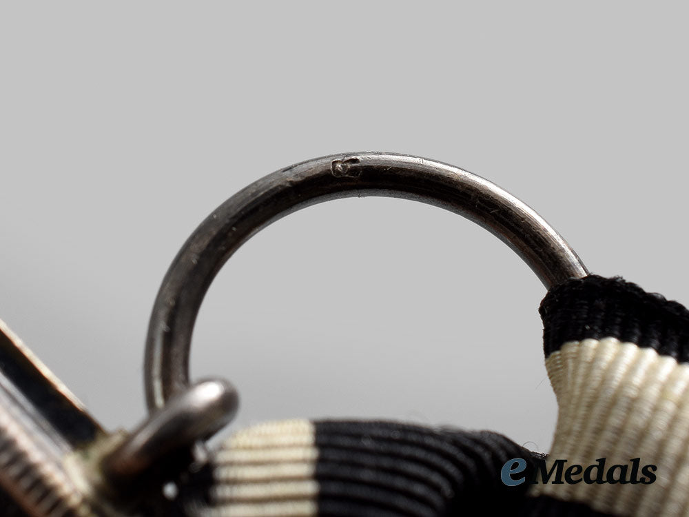 2. A 1914 award, constructed of iron and silver, on loop for suspension from its period original ribbon, consisting of a Cross Pattée with a blackened magnetic iron core within a ribbed silver frame, the obverse with a central initial “W”, the six o’clock arm with a restitution date of “1914”, the twelve o’clock arm with a royal crown, the reverse with three central oak leaves, the six o’clock arm with a reinstitution date of “1813”, the twelve o’clock arm with initials “FW” topped by a royal crown, the suspension loop maker marked “R” for an unidentified manufacturer, measuring 42.22 mm (w) x 45.76 mm (h), weighing 19.5 grams (inclusive of ribbon), in extremely fine condition.
