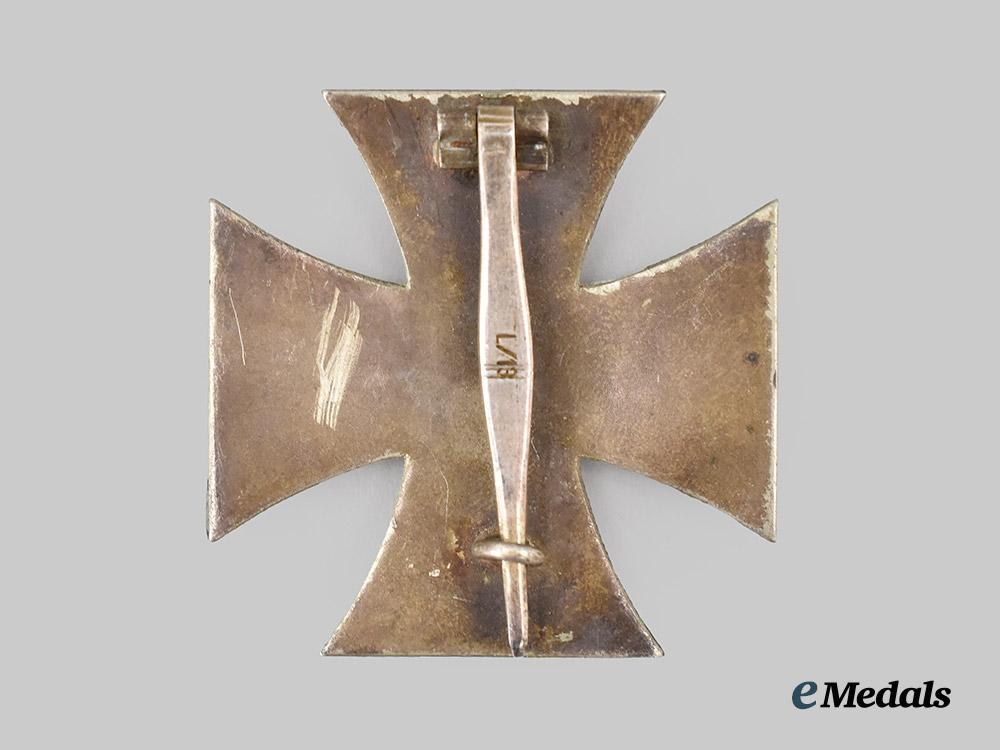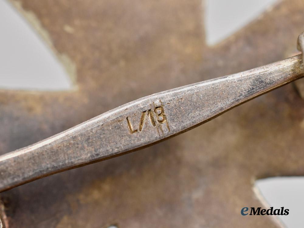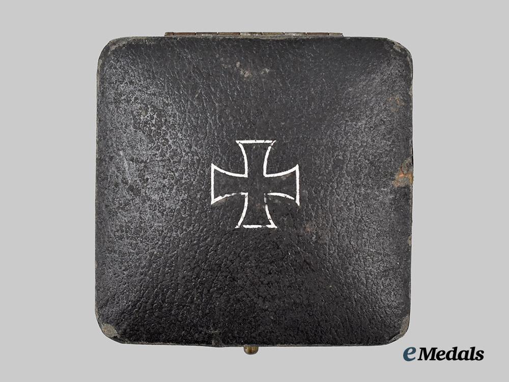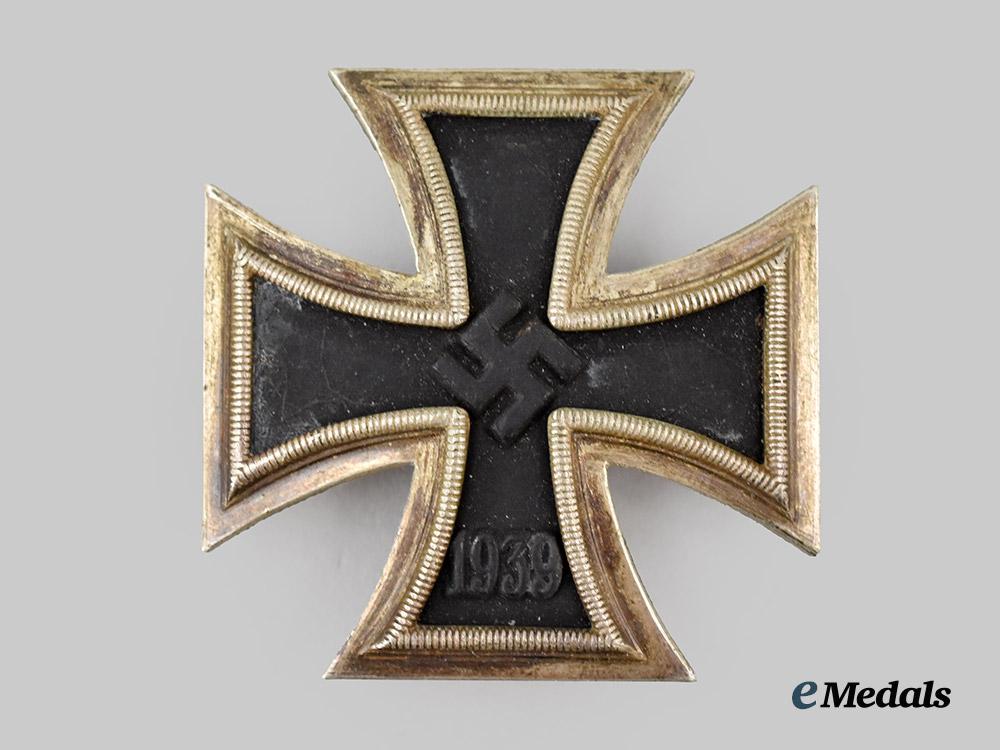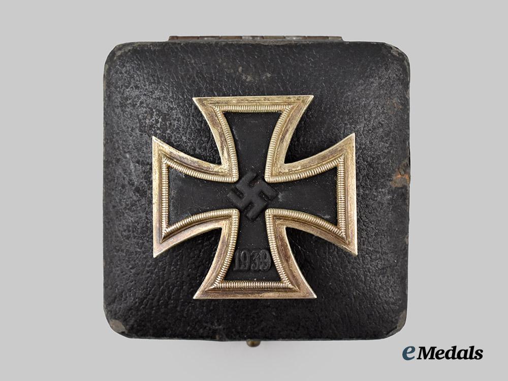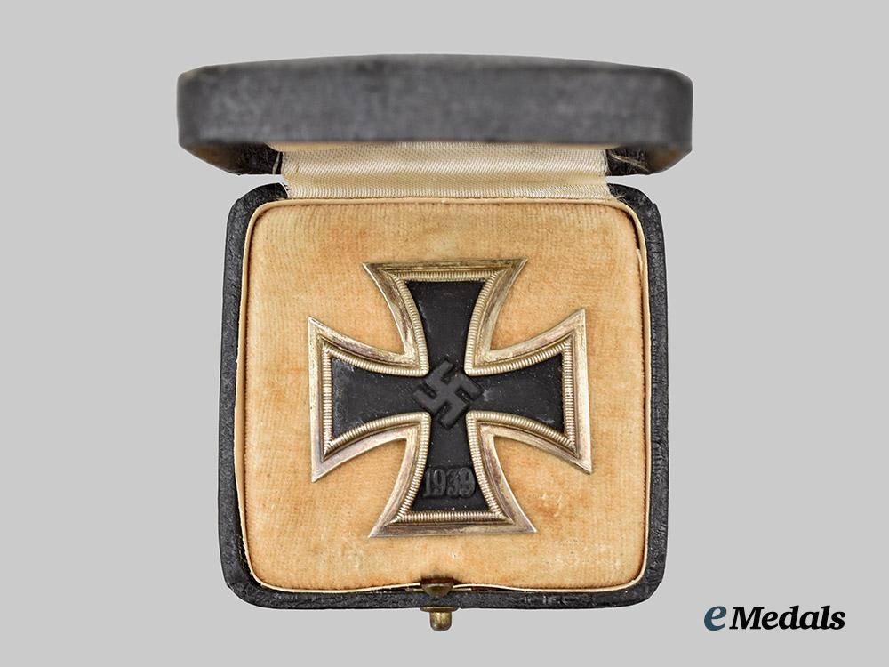 (Eisernes Kreuz 1939 I. Klasse). Reinstituted 1 September 1939. (1939-1945 issue). Constructed of iron and silver, consisting of a Cross Pattée with a blackened magnetic iron core within a ribbed silver frame, the obverse with a central mobile swastika, the six o’clock arm with a reinstitution date of “1939”, the reverse with a block hinge and banjo-style pinback meeting a round wire catch, maker marked with LDO code “L/13” for Paul Meybauer, Berlin, measuring 44.17 mm (w) x 43.91 mm (h), weighing 18.9 grams, accompanied by its original presentation case, constructed of a pressed card stock frame with a faux black leather exterior liner, the lid bearing a silvered Cross Pattée, the interior with a white rayon lid liner and intact hinge cover, with a slotted off-white felt medal bed, closing with a functional metal spring catch with exterior stud release, unmarked, measuring 70 mm (w) x 70 mm (l) x 30 mm (h), the cross has been hand-vaulted post-manufacture to suit the recipient’s desired style of wear, with minor loss of finish and material fatigue visible to the core and case, respectively, a late-pin variant produced using Meybauer’s B Core in overall very fine condition.
