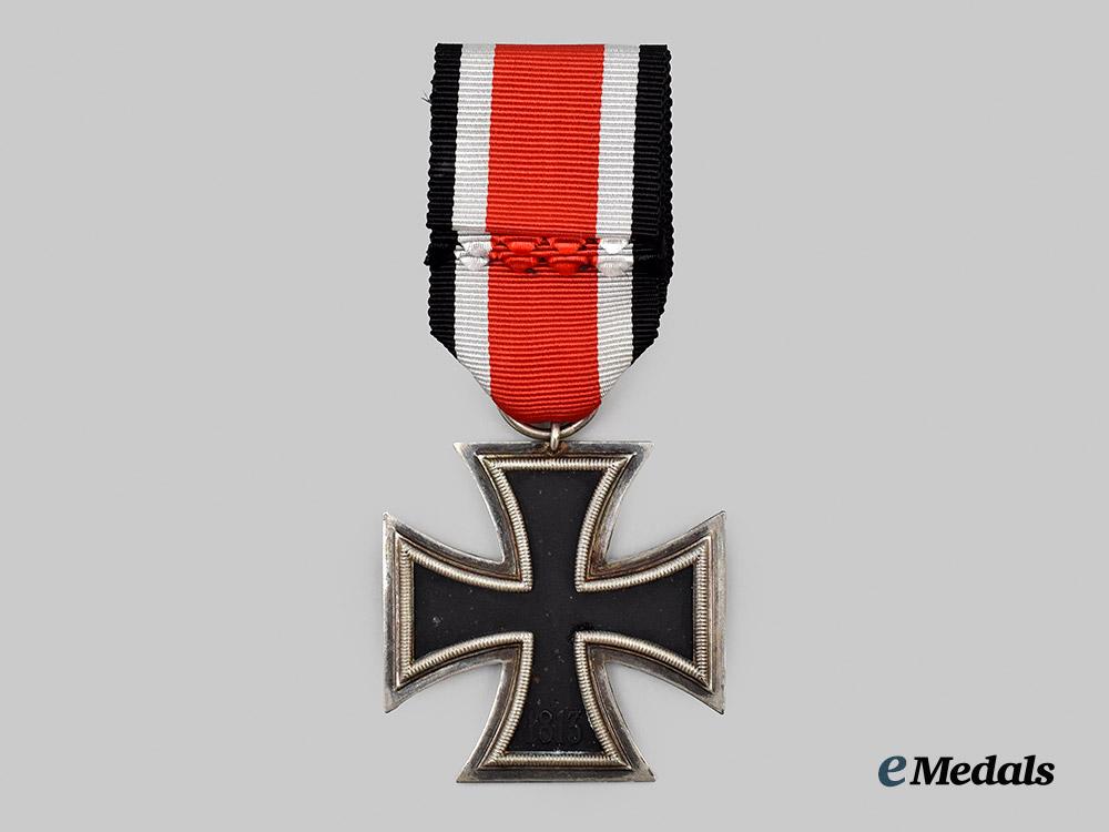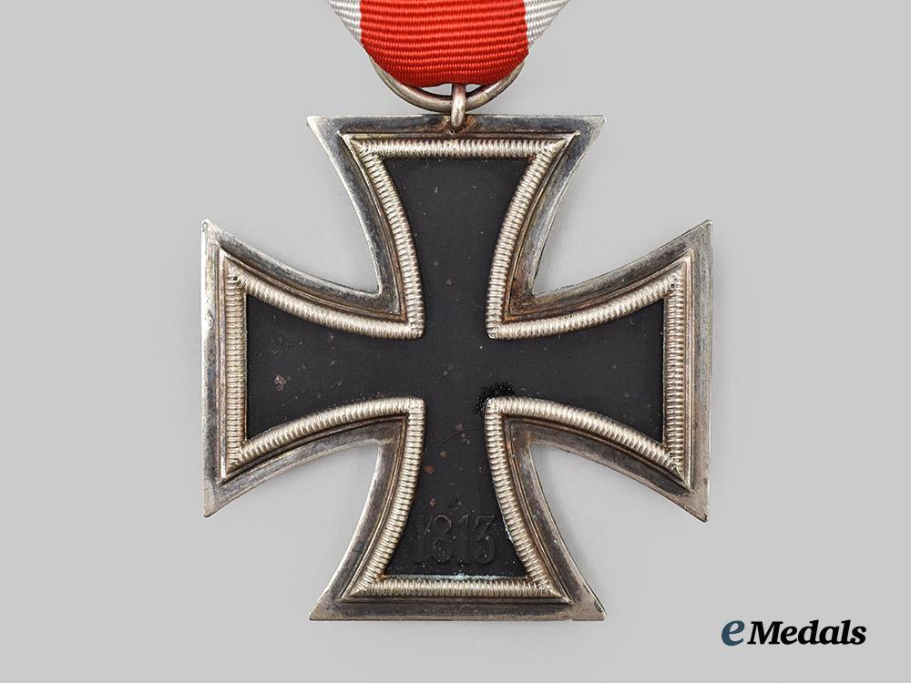 (Eisernes Kreuz 1939 II. Klasse). Reinstituted 1 September 1939. (1939-1945 issue). Constructed of iron and silver, on loop for suspension from its period original ribbon, consisting of a Cross Pattée with a blackened magnetic iron core within a ribbed silver frame, the obverse with a central mobile swastika, the six o’clock arm with a reinstitution date of “1939”, the reverse six o’clock arm with an initial institution date of “1813”, the suspension loop maker marked with Präsidialakanzlei code “27” for Anton Schenkls Nachfolger, Vienna, measuring 43.83 mm (w) x 46.82 mm (h), weighing 19.7 grams, in extremely fine condition.