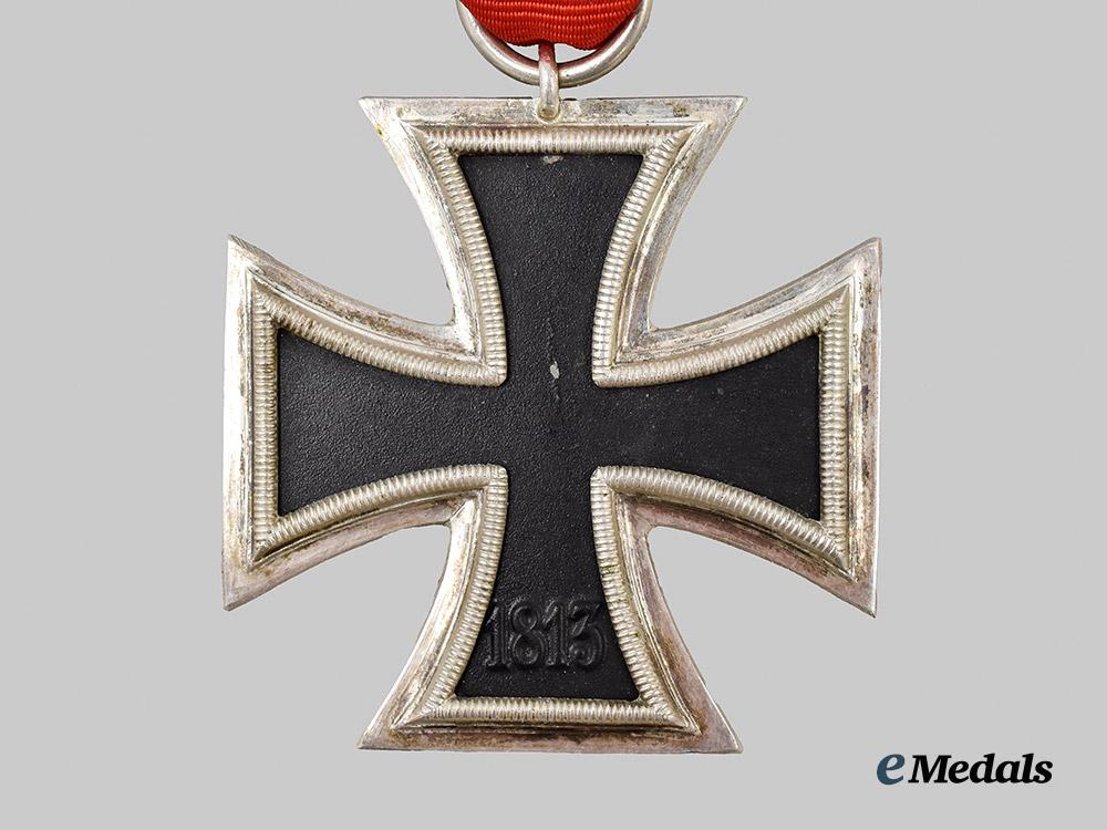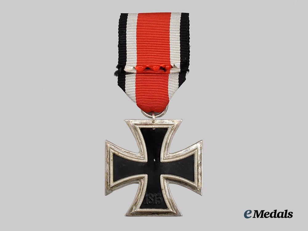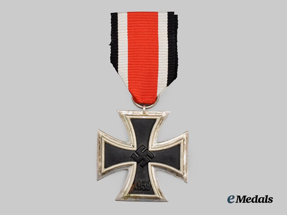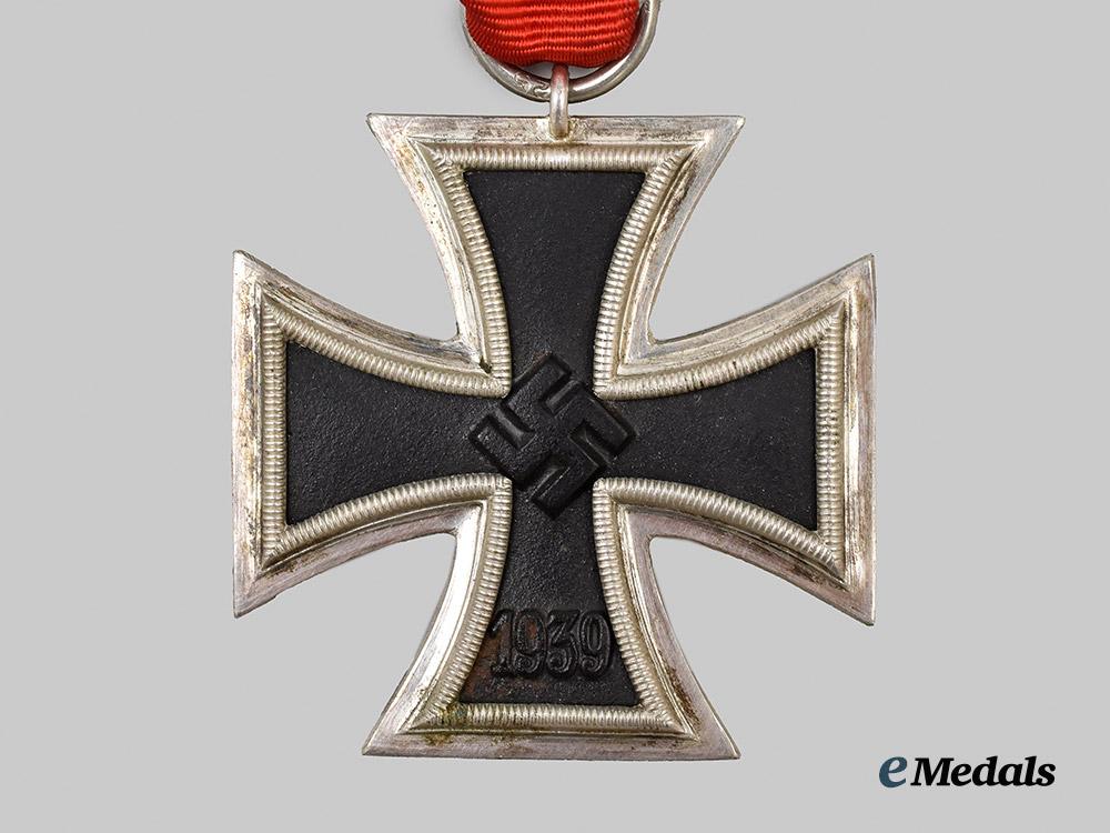 (Eisernes Kreuz 1939 II. Klasse). Reinstituted 1 September 1939. (1939-1945 issue). Constructed of iron and silver, on loop for suspension from its period original ribbon, consisting of a Cross Pattée with a blackened magnetic iron core within a ribbed silver frame, the obverse with a central mobile swastika, the six o’clock arm with a reinstitution institution date of “1939”, the reverse six o’clock arm with an initial institution date of “1813”, the suspension loop maker marked with Präsidialkanzlei code “25” for Arbeitsgemeinschaft der Hanauer Silber- und Goldschmiedeinnung, measuring 44.23 mm (w) x 47.70 mm (h), weighing 19.2 grams, in extremely fine condition.