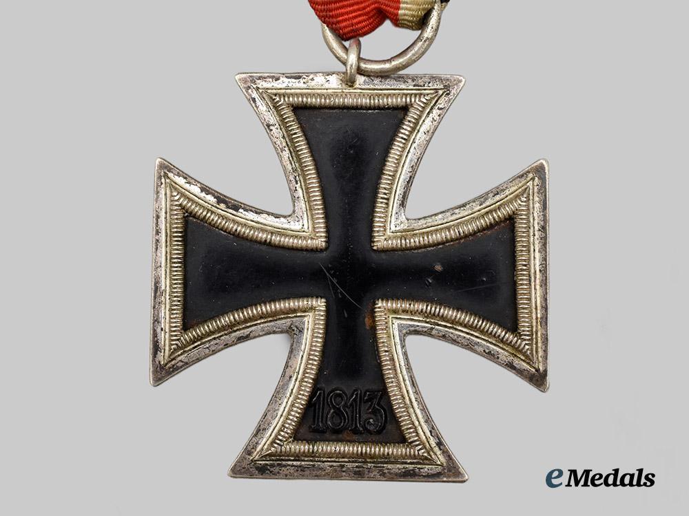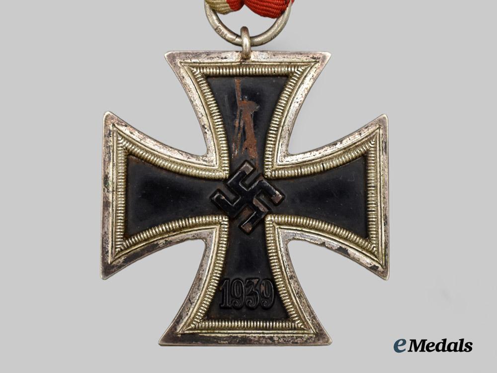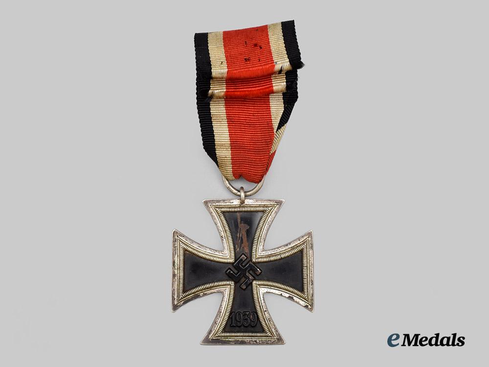 (Eisernes Kreuz 1939 II. Klasse). Reinstituted 1 September 1939. (1939-1945 issue). Constructed of iron and silver, on loop for suspension from its period original ribbon, consisting of a Cross Pattée with a blackened magnetic iron core within ribbed silver frame, the obverse with a central mobile swastika, the six o’clock arm with a reinstitution date of “1939”, the reverse six o’clock arm with an initial institution date of “1813”, the suspension loop maker marked with Präsidialkanzlei code “113” for Hermann Aurich, Dresden, measuring 4.3,27 mm (w) x 48.01 mm (h), weighing 17.1 grams, demonstrating some scratching and loss of finish to the core resulting in surface oxidation, in very fine condition.