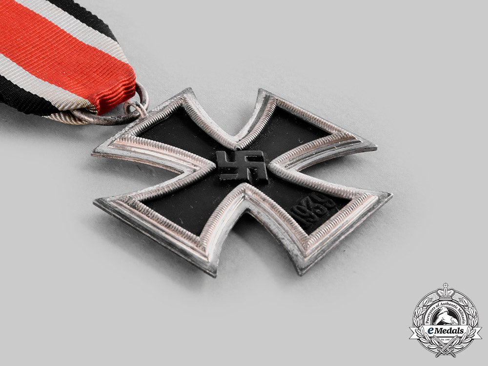 (Eisernes Kreuz 1939 II. Klasse). Reinstituted 1 September 1939. (1939-1945). Constructed of iron and silver, on loop for suspension from its period original ribbon, consisting of a Cross Pattée with a blackened magnetic iron core within a ribbed silver frame, the obverse with a central mobile swastika, the six o’clock arm with a reinstitution date of “1939”, the six o’clock arm with an initial institution date of “1813”, the suspension loop maker marked with Präsidialkanzlei code “65” for Klein & Quenzer, Ider-Oberstein, measuring 44.35 mm (w) x 48.56 mm (h), weighing 17.1 grams, accompanied by its period original package of issue, constructed of blue paper stock, the exterior bearing an inscription of “EISERNES KREUZ 2. KLASSE 1939” and a maker’s mark of “KLEIN & QUENZER, OBERSTEIN”, measuring 105 mm (w) x 128 mm (h), in overall extremely fine condition.