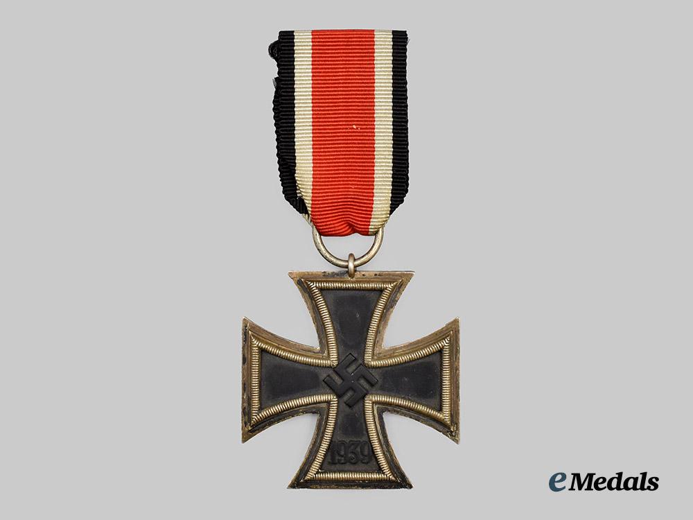 (Eisernes Kreuz 1939 II. Klasse). Reinstituted 1 September 1939. (1939-1945 issue). Constructed of iron and silver, on loop for suspension from its period original ribbon, consisting of a Cross Pattée with a blackened magnetic iron core within a ribbed silver frame, the obverse with a central mobile swastika, the six o’clock arm with a reinstitution date of “1939”, the reverse six o’clock arm with an initial institution date of “1813”, the suspension loop maker marked with Präsidialkanzlei code “65” for Klein & Quenzer, Idar-Oberstein, measuring 44.37 mm (w) x 47.97 mm (h), weighing 18.1 grams, in near extremely fine condition.