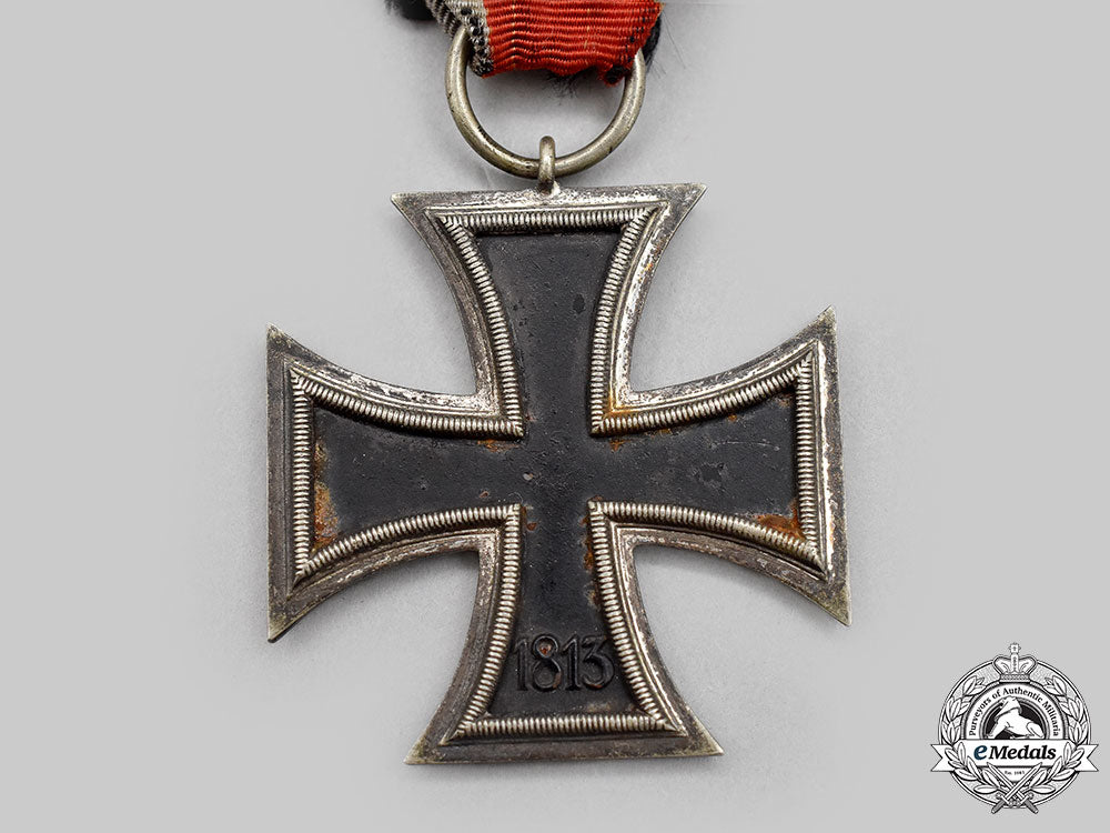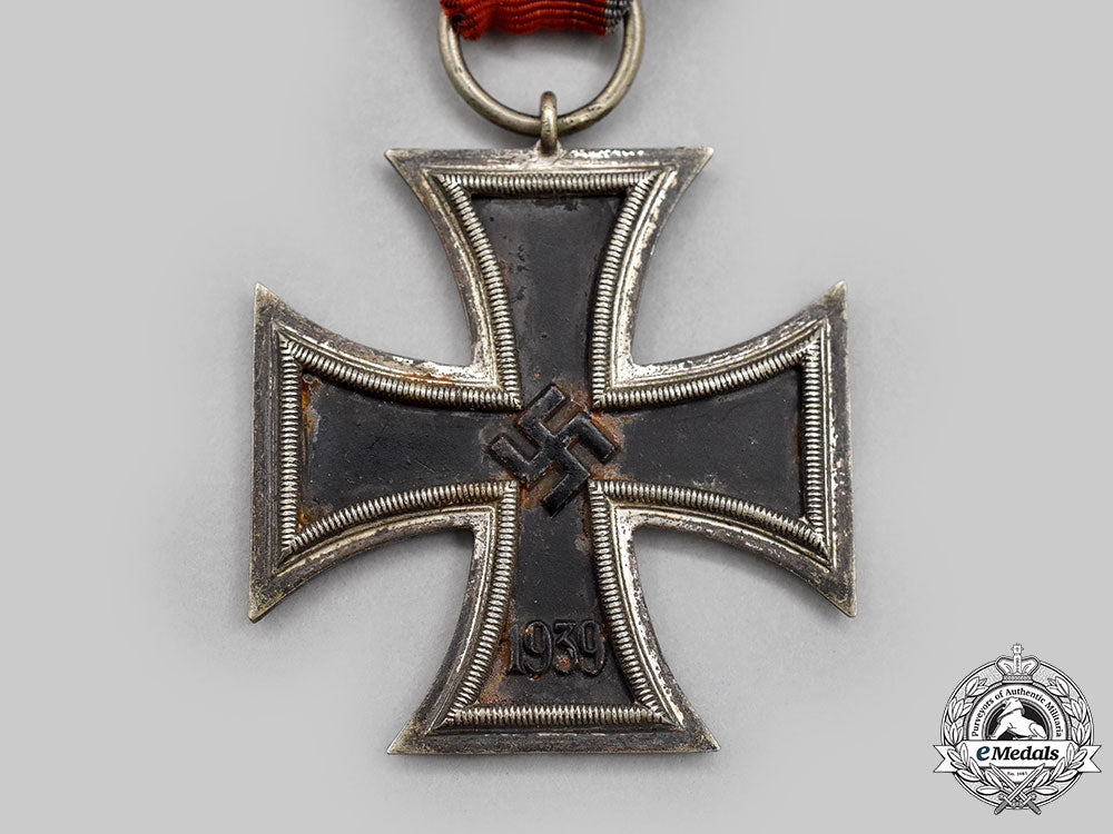 (Eisernes Kreuz 1939 II. Klasse). Reinstituted 1 September 1939. (1939-1945 issue). Constructed of iron and silver, on loop for suspension from its period original ribbon, consisting of a Cross Pattée with blackened magnetic iron core within a ribbed silver frame, the obverse with central mobile swastika, the six o’clock arm with a reinstitution date of “1939”, the reverse six o’clock arm with an initial institution date of “1813”, unmarked but demonstrating the clear characteristics of a Schinkel-form lug variant by Wilhelm Deumer, Lüdenscheid, , measuring 43.56 mm (w) x 47.76 mm (h), weighing 16.8 grams, with sporadic oxidation evident to the core, a scarce example in very fine condition.