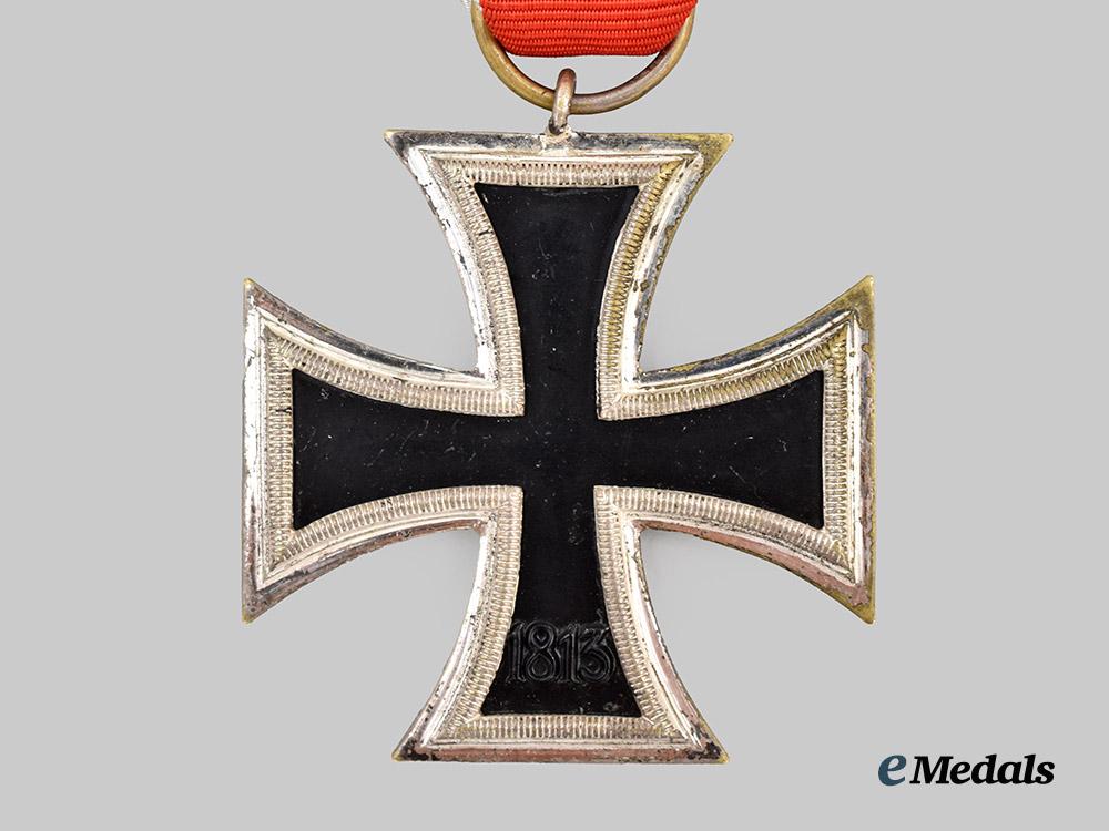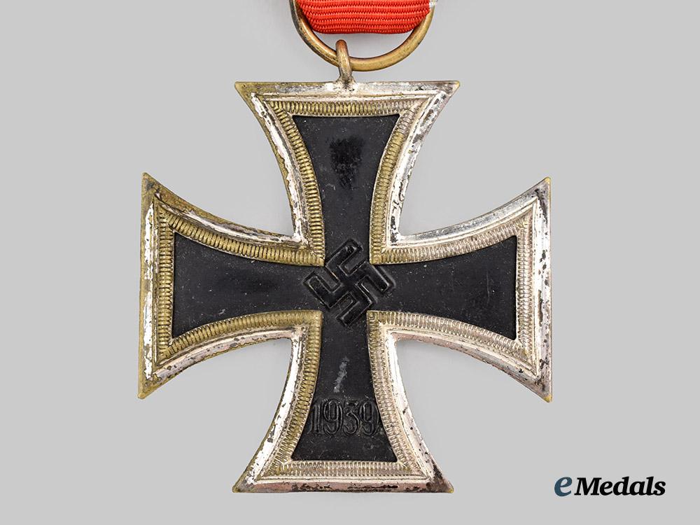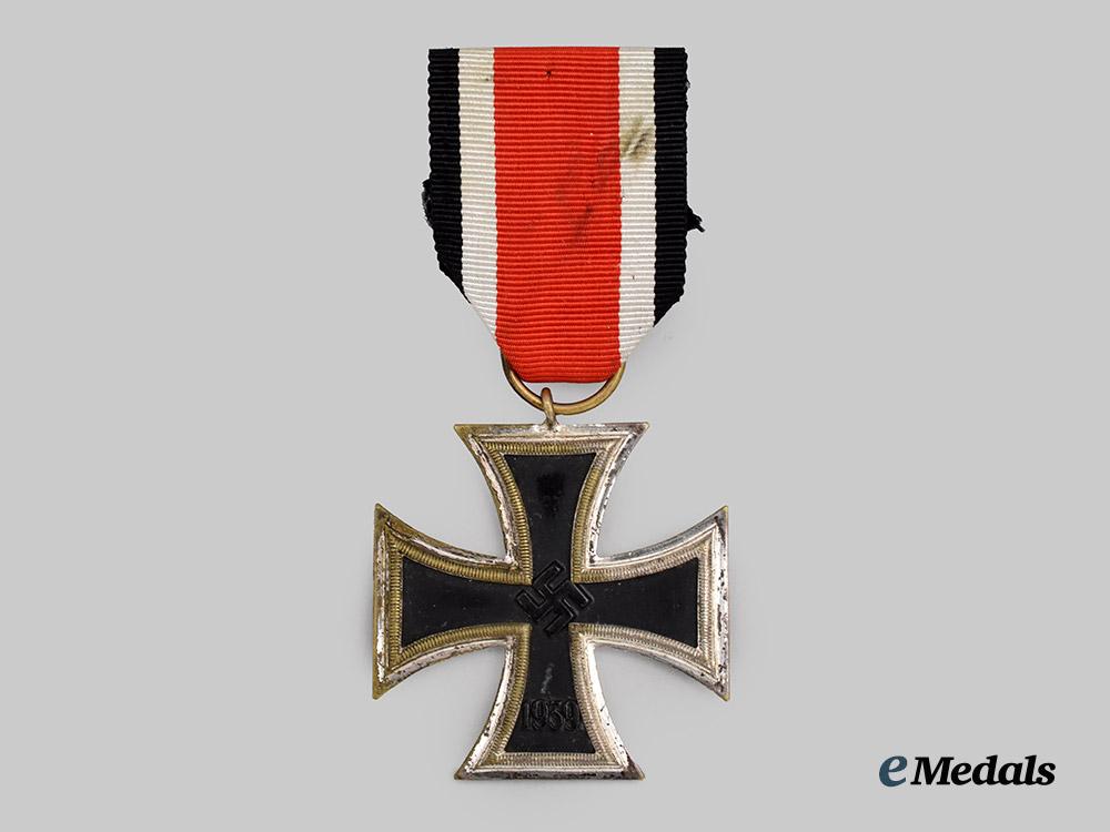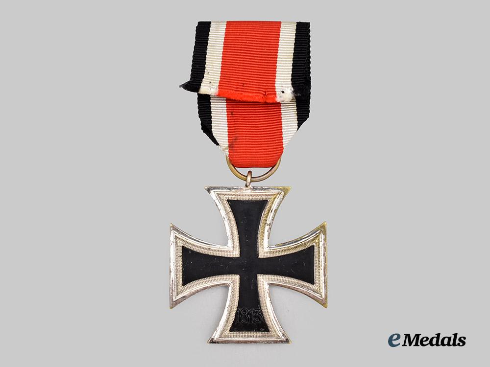 (Eisernes Kreuz 1939 II. Klasse). Reinstituted 1 September 1939. (1939-1945 issue). Constructed of iron and silver, on loop for suspension from its period original ribbon, consisting of a Cross Patée with a blackened non-magnetic metal core within a ribbed silver frame, the obverse with a central mobile swastika, the six o’clock arm with a reinstitution date of “1939”, the reverse six o’clock arm with an initial institution date of “1813”, unmarked but demonstrating the characteristics of an early Schinkel-form variant produced by Wilhelm Deumer, Lüdenscheid, measuring 43.46 mm (w) x 47.68 mm (h), weighing 16.4 grams, in near extremely fine condition.