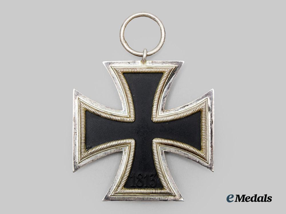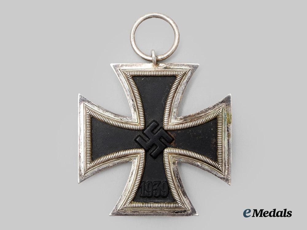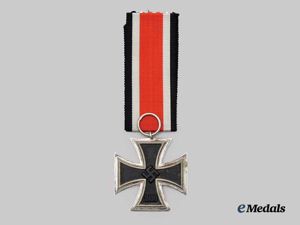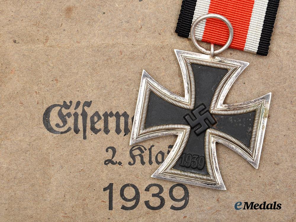 (Eisernes Kreuz 1939 II. Klasse). Reinstituted 1 September 1939. (1939-1945 issue). Constructed of iron and silver, on loop for suspension from its period original ribbon, consisting of a Cross Pattée with a blackened magnetic iron core within a ribbed silver frame, the obverse with a central mobile swastika, the six o’clock arm with a reinstitution date of “1939”, the reverse six o’clock arm with an initial institution date of “1813”, unmarked but demonstrating the characteristics of manufacture by Gottlieb & Wagner, Idar-Oberstein, measuring 44.25 mm (w) x 48.16 mm (h), weighing 18.9 grams, accompanied by its original package of issue, constructed of slate-grey paper stock, the exterior bearing an inscription of “EISERNES KREUZ 2. KLASSE” and a maker’s mark of “GOTTLIEB & WAGNER, OBERSTEIN/NAHE”, measuring 10.5 cm (w) x 13 cm (h), a complete set from an uncommon manufacturer in extremely fine condition.