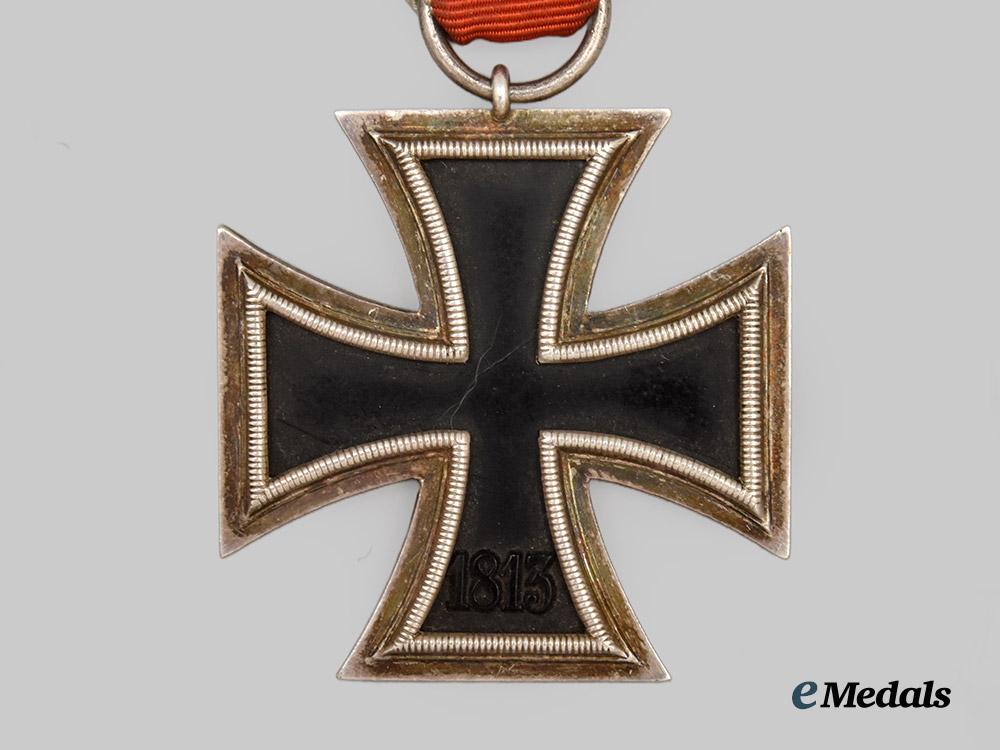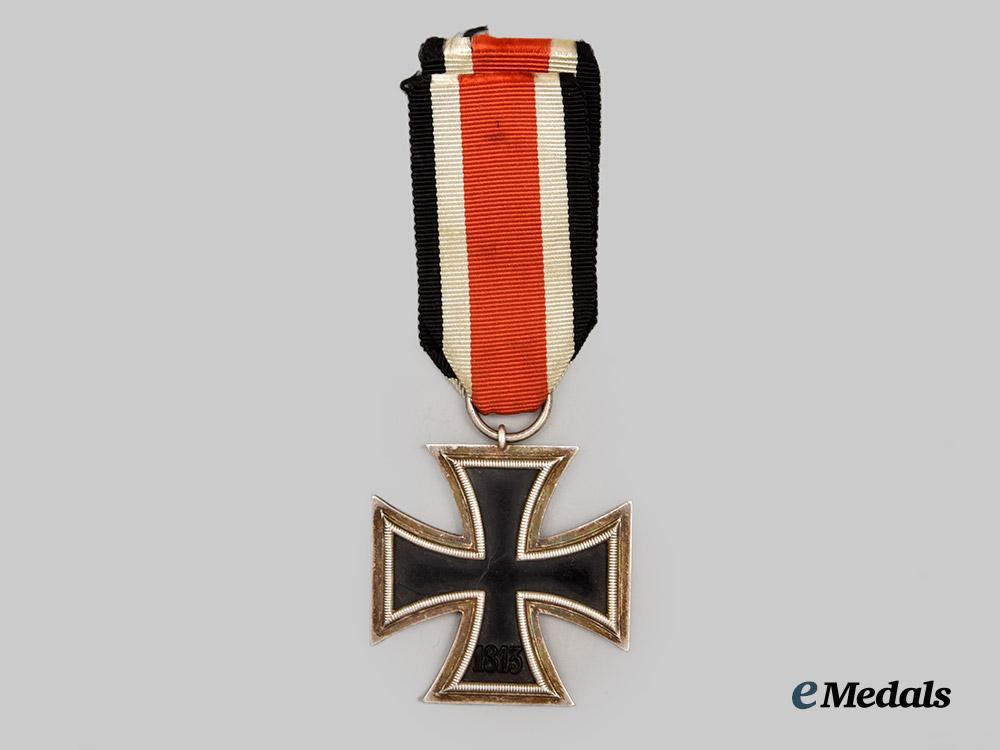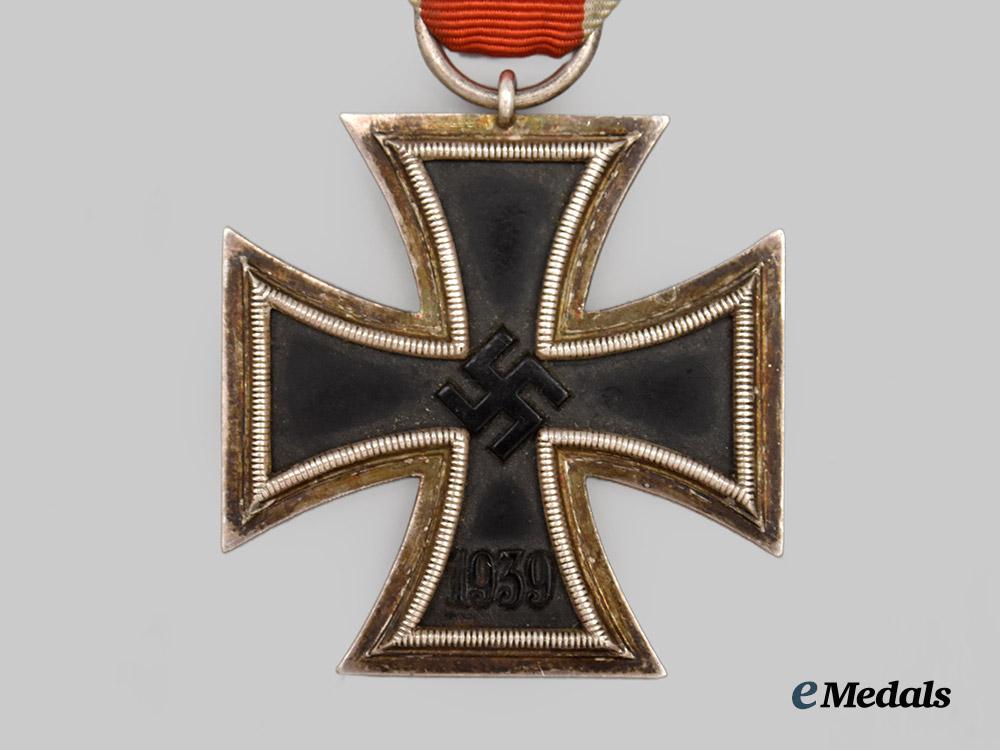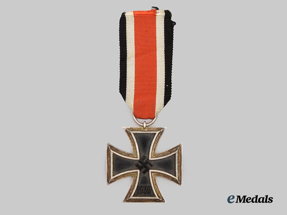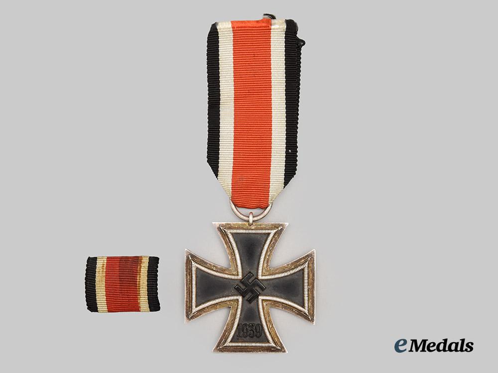 (Eisernes Kreuz 1939 II. Klasse mit Bandschnalle). Reinstituted 1 September 1939. (1939-1945 issue). Constructed of iron and silver, on loop for suspension from its period original ribbon, consisting of a Cross Pattée with a blackened magnetic iron core within a ribbed silver frame, the obverse with a central mobile swastika, the six o’clock arm with a reinstitution date of “1939”, the reverse six o’clock arm with an initial institution date of “1813”, unmarked, measuring 43.70 mm (w) x 47.09 mm (h), weighing 17.7 grams, in extremely fine condition, accompanied by a matching ribbon bar, mounted on a 25 mm-long zink core with a horizontal pinback, demonstrating soiling throughout, in very fine condition.