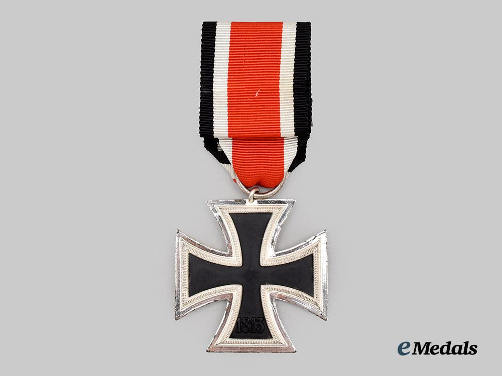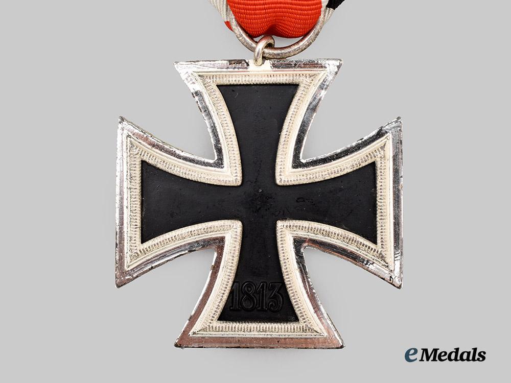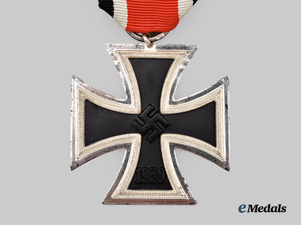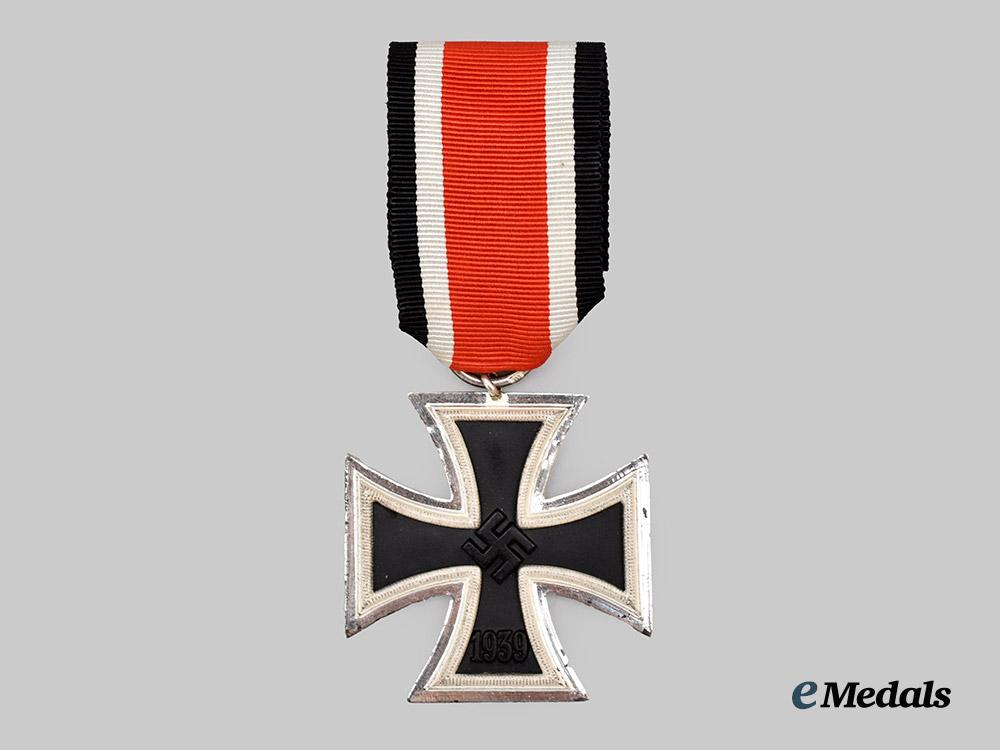 (Eisernes Kreuz 1939 II. Klasse). Reinstituted 1 September 1939. (1939-1945 issue). Constructed of iron and silver, on loop for suspension from its period original ribbon, consisting of a Cross Pattée with a blackened magnetic iron core within a ribbed silver frame, the obverse with a central mobile swastika, the six o’clock arm with a reinstitution date of “1939”, the reverse six o’clock arm with an initial institution date of “1813”, the suspension loop maker marked with Präsidialkanzlei code “13” for Gustav Brehmer, Markneukirchen, measuring 44.00 mm (w) x 47.90 mm (h), weighing 18.6 grams, the integral ring sits slightly askew, a striking example retaining virtually all of its original frosting in near mint condition.