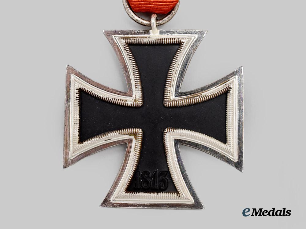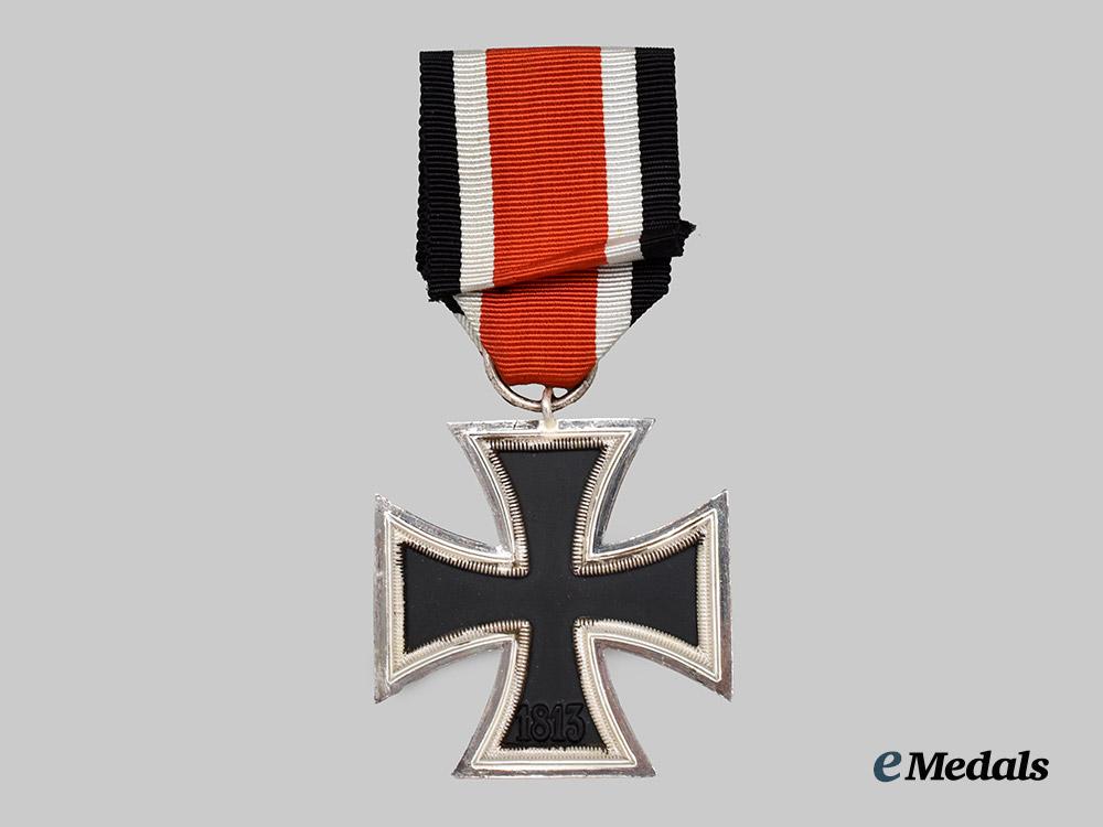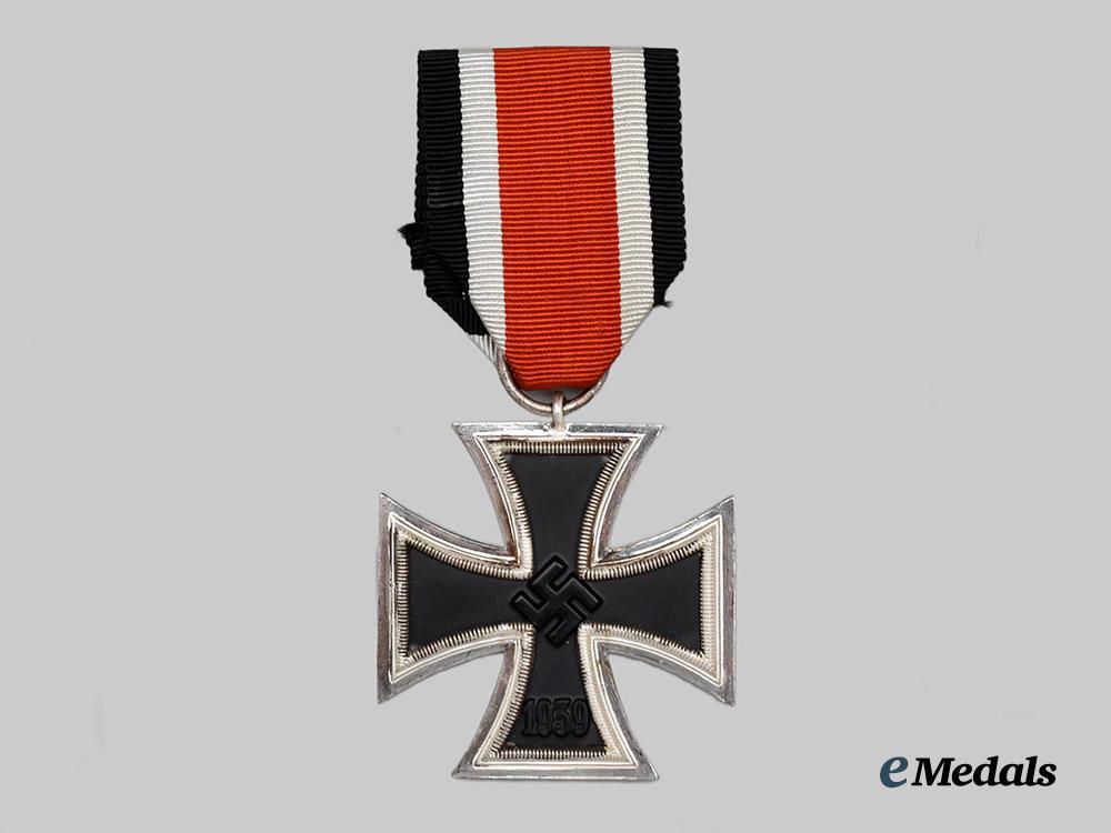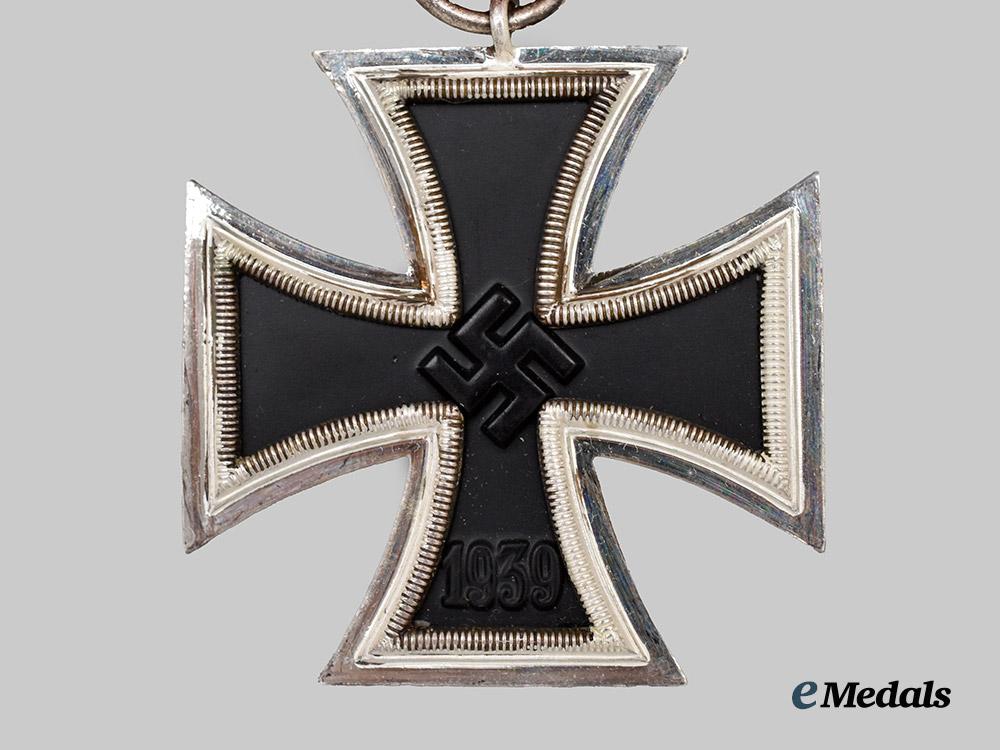 (Eisernes Kreuz 1939 II. Klasse). Reinstituted 1 September 1939. (1939-1945 issue). Constructed of iron and silver, on loop for suspension from its period original ribbon, consisting of a Cross Pattée with a blackened magnetic iron core within a ribbed silver frame, the obverse with a central mobile swastika, the six o’clock arm with a reinstitution date of “1939’, the reverse six o’clock arm with an initial institution date of “1813”, unmarked, measuring 44.15 mm (w) x 47.86 mm (h), weighing 19.5 grams, a striking example in near mint condition.