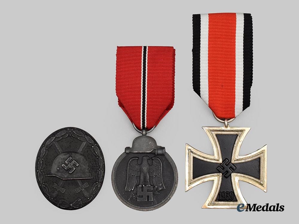 3. An Eastern Front Medal, constructed of silvered and patinated zink, the obverse bearing a raised Heer-style German national eagle clutching a swastika, the reverse bearing a raised inscription of “WINTERSCHLACHT IM OSTEN 1941/42” (“WINTER BATTLE IN THE EAST 1941/42”), above a crossed sword and laurel branch, topped by a Stahlhelm and stick grenade, the suspension loop maker marked with Präsidialkanzlei code “6” for Fritz Zimmermann, Stuttgart, measuring 35.80 mm (w) x 44.24 mm (h), weighing 20.4 grams, demonstrating moderate loss of finish to the base metal, in better than very fine condition.