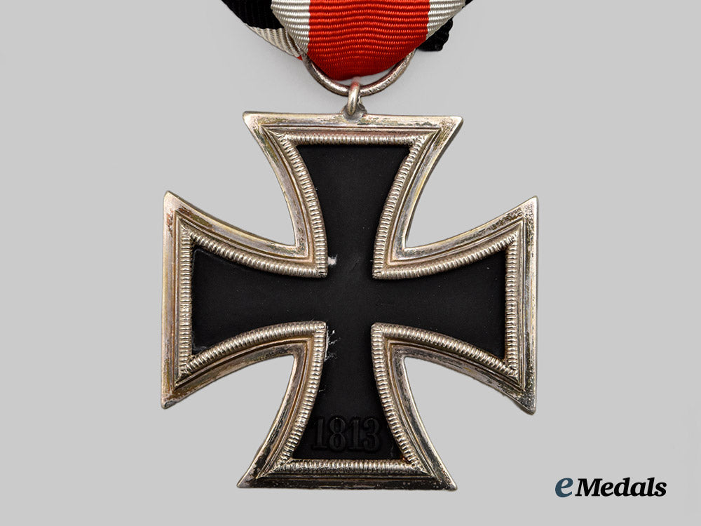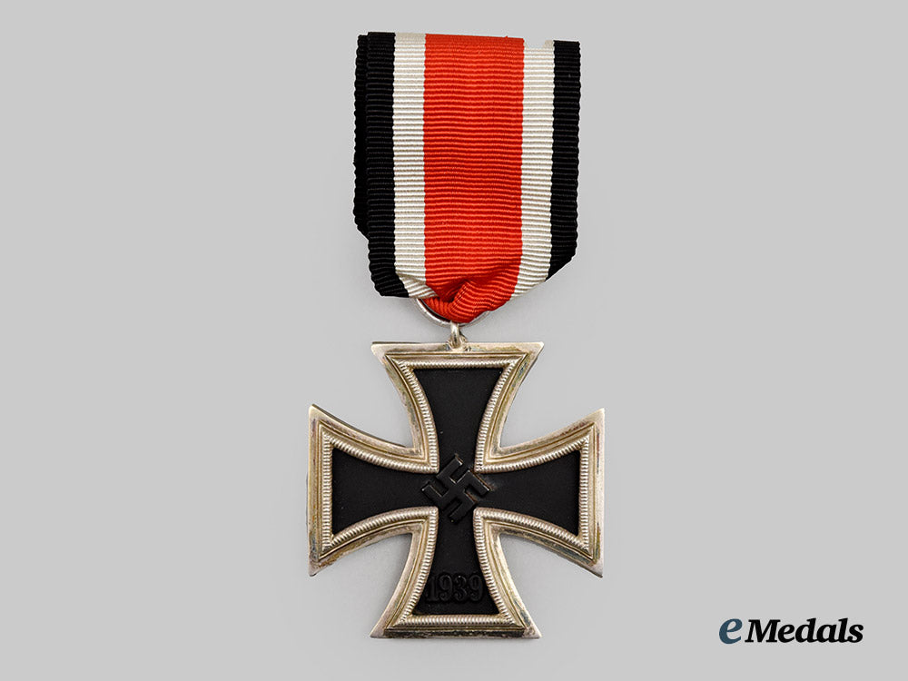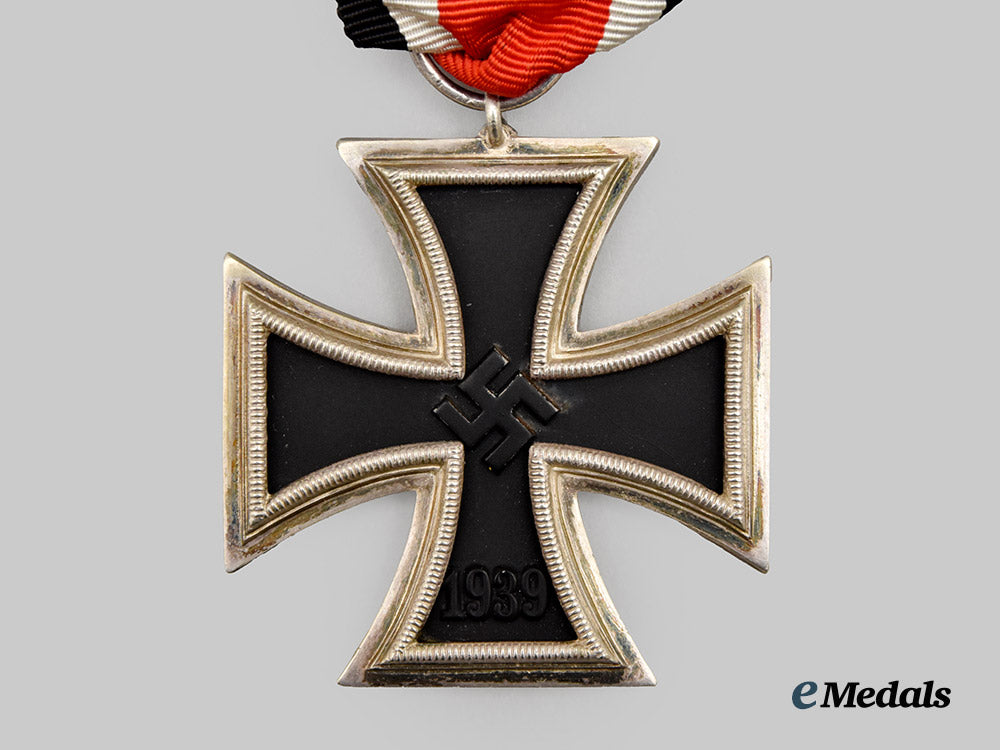 (Eisernes Kreuz 1939 II. Klasse). Reinstituted 1 September 1939. (1939-1945 issue). Constructed of iron and silver, on loop for suspension from its period original ribbon, consisting of a Cross Pattée with a blackened magnetic iron core within a ribbed silver frame, the obverse with a central mobile swastika, the six o’clock arm with a reinstitution date of “1939”, the reverse six o’clock arm with an initial institution date of “1813”, unmarked but demonstrating the characteristics of a Round 3 version produced by Deschler & Sohn, Munich, using the company’s B-Core and characteristic thick frame, measuring 44.33 mm (w) x 48.88 mm (h), weighing 21.9 grams, a rare example in extremely fine condition.