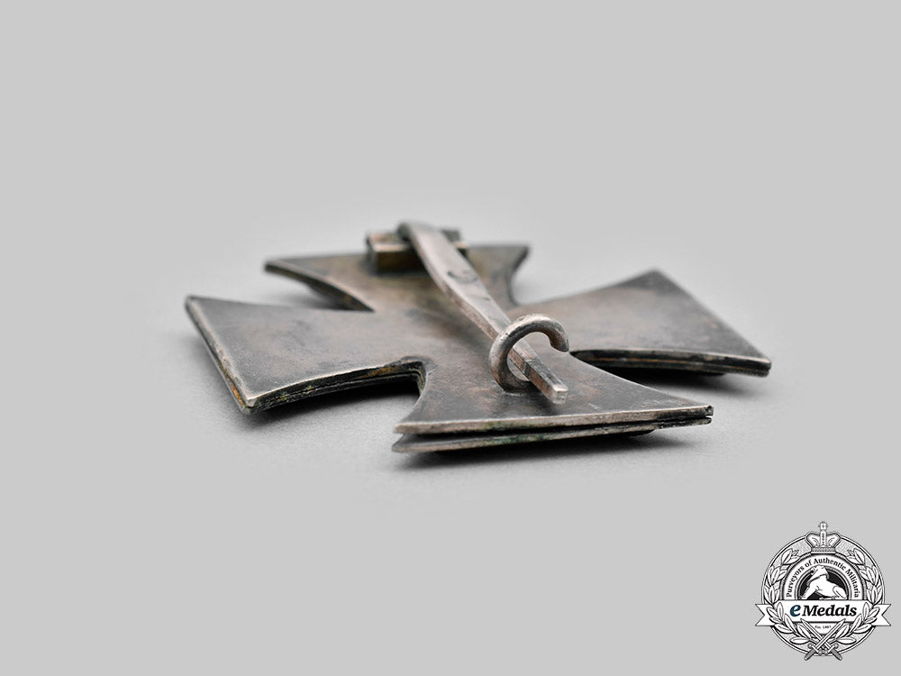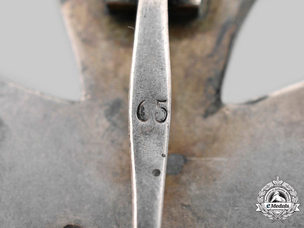 (Eisernes Kreuz 1939 I. Klasse). Reinstituted 1 September 1939. (1939-1945 issue). Constructed of iron and silver, consisting of a Cross Pattée with a blackened magnetic iron core within a ribbed silver frame, the obverse with a central mobile swastika, the six o’clock with a reinstitution date of “1939”, the reverse with a block hinge and banjo-style pinback meeting a round wire catch, the pinback maker marked with Präsidialkanzlei code “65” for Klein & Quenzer, Idar-Oberstein, measuring 44.21 mm (w) x 44.37 mm (h), weighing 20.1 grams, oxidation is evident to the core and the frame has partially separated along the seam of the six o’clock arm, in overall very fine condition.