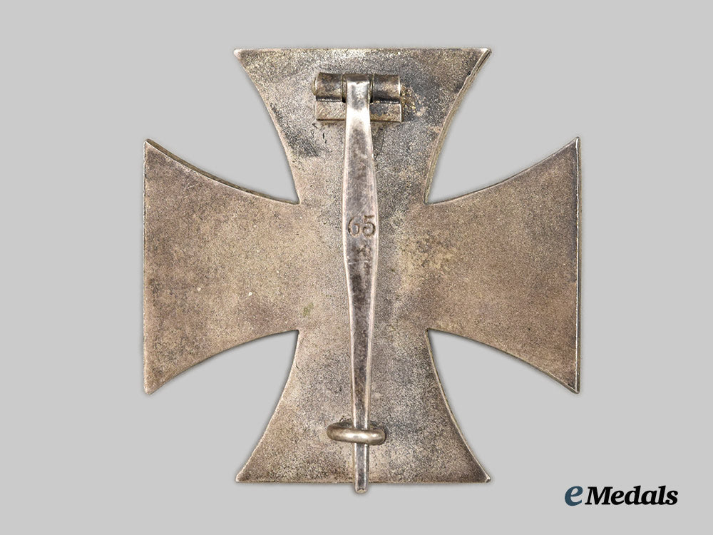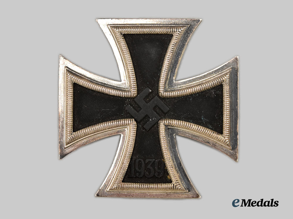 (Eisernes Kreuz 1939 I. Klasse). Reinstituted 1 September 1939. (1939-1945 issue). Constructed of iron and silver, consisting of a Cross Pattée with a blackened magnetic iron core within a ribbed silver frame, the obverse with a central mobile swastika, the six o’clock arm with a reinstitution date of “1939”, the reverse with a block hinge and banjo-style pinback meeting a round wire catch, the pinback maker marked with Präsidialkanzlei code “65” for Klein & Quenzer, Idar-Oberstein, measuring 44.38 mm (w) x 44.32 mm (h), weighing 20.9 grams, in extremely fine condition.