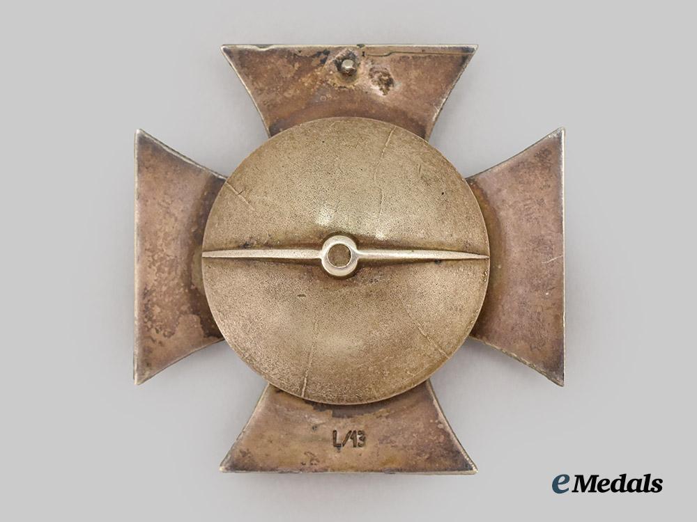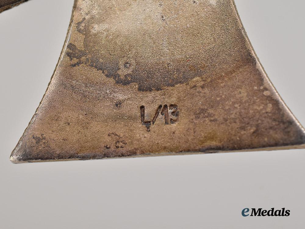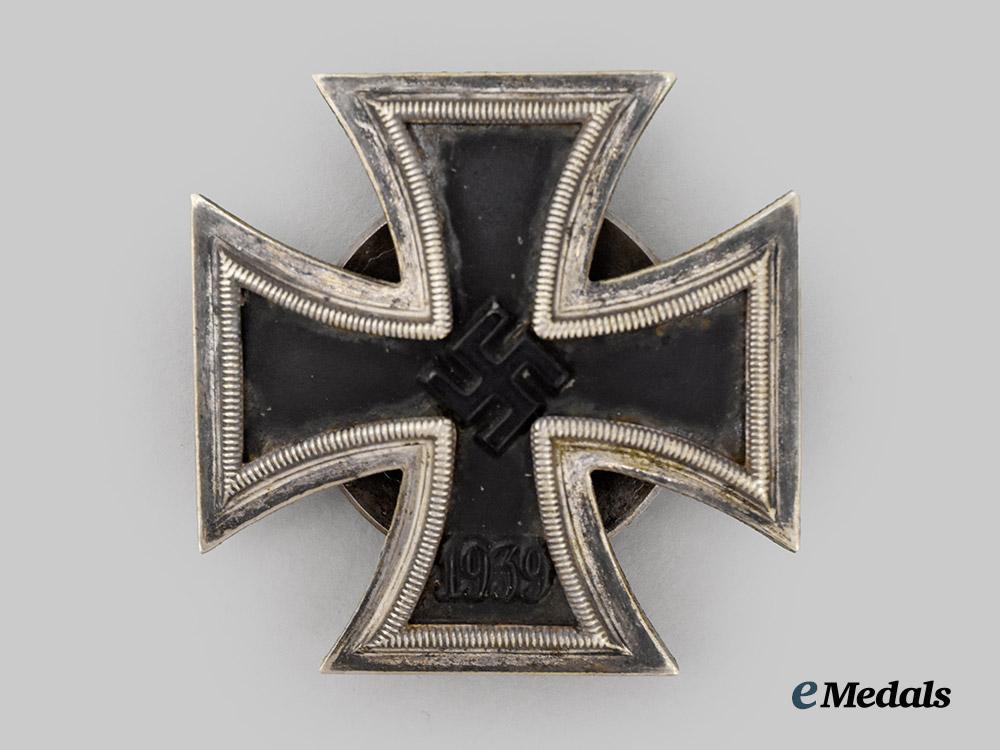 (Eisernes Kreuz 1939 I. Klasse). Reinstituted 1 September 1939. (1939-1945 issue). Constructed of iron and silver, consisting of a Cross Pattée with a blackened magnetic iron core within a ribbed silver frame, the obverse with a central mobile swastika, the six o’clock arm with a reinstitution date of “1939”, the reverse with a central screwpost retaining an original backplate, the twelve o’clock arm topped by a stabilizer, and the six o’clock arm maker marked with LDO code “L/13” indicating manufacture by Paul Maybauer, Berlin, measuring 44.09 mm (w) x 43.90 mm (h), weighing 21.0 grams (inclusive of backplate), demonstrating minor loss of finish to the core resulting in minor surface oxidation, a complete screwback set featuring Meybauer’s B-Type core in better than very fine condition.