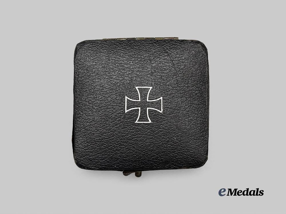 (Eisernes Kreuz 1939 I. Klasse mit Etui). Reinstituted 1 September 1939. (1939-1945 issue). Constructed of iron and silver, consisting of a Cross Pattée with a blackened magnetic iron core within a ribbed silver frame, the obverse with a central mobile swastika, the six o’clock arm with reinstitution date of “1939”, the reverse with a block hinge and banjo-style pinback meeting a flattened and rounded catch, unmarked but demonstrating the characteristics of manufacture by Rudolf Souval, Vienna, measuring 44.31 mm (w) x 44.27 mm (h), weighing 19.8 grams, accompanied by its original presentation case, constructed of a pressed card stock frame with a faux black leather exterior liner, the lid bearing a silvered Cross Pattée, the interior with a white rayon lid liner and intact hinge cover, with a slotted beige felt medal bed, closing with a functional metal spring catch with exterior stud release, unmarked, measuring 70 mm (w) x 70 mm (l) x 20 mm (h), demonstrating a consistent patina throughout the cross, with minor material fatigue visible to the exterior of the case, in overall extremely fine condition.