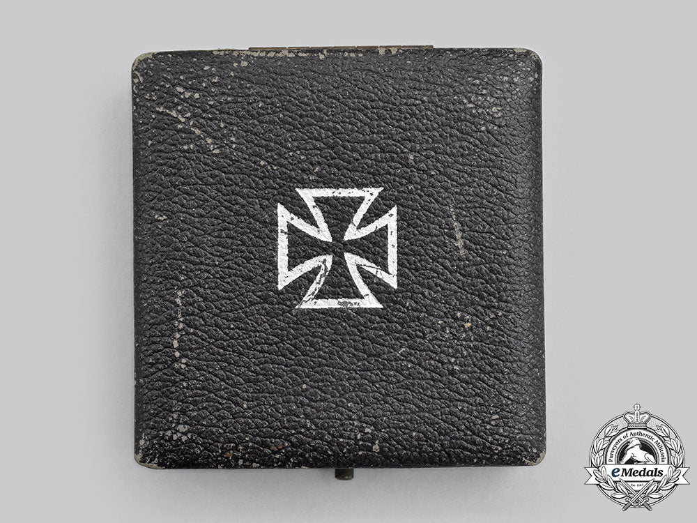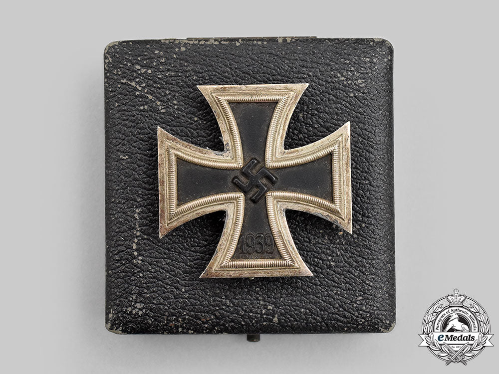 (Eisernes Kreuz 1939 I. Klasse mit Etui). Reinstituted 1 September 1939. (1939-1945 issue). Constructed of iron and silver, consisting of a Cross Pattée with a blackened magnetic iron core within a ribbed silver frame, the obverse with a central mobile swastika, the six o’clock arm with a reinstitution date of “1939”, the reverse with a barrel hinge and banjo-style pinback meeting a round wire catch, unmarked, measuring 44.06 mm (w) x 47.30 mm (h), weighing 18.3 grams, accompanied by its period original presentation case, constructed of a light wooden frame with a faux black leather exterior liner, the lid bearing a silver Cross Pattée, the interior with a white rayon lid liner and intact hinge cover, with a slotted beige felt medal bed, closing with a functional metal spring catch with exterior stud release, unmarked, measuring 68 mm (w) x 68 mm (l) x 20 mm (h), in overall near extremely fine condition.