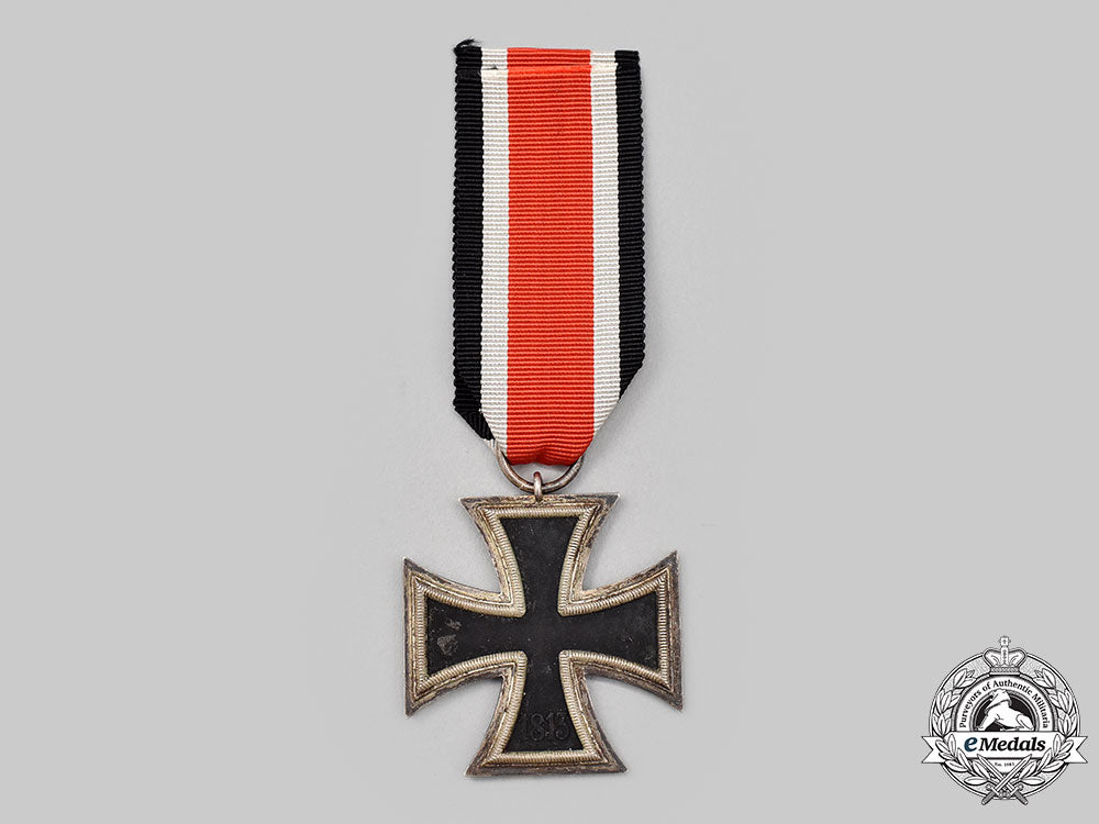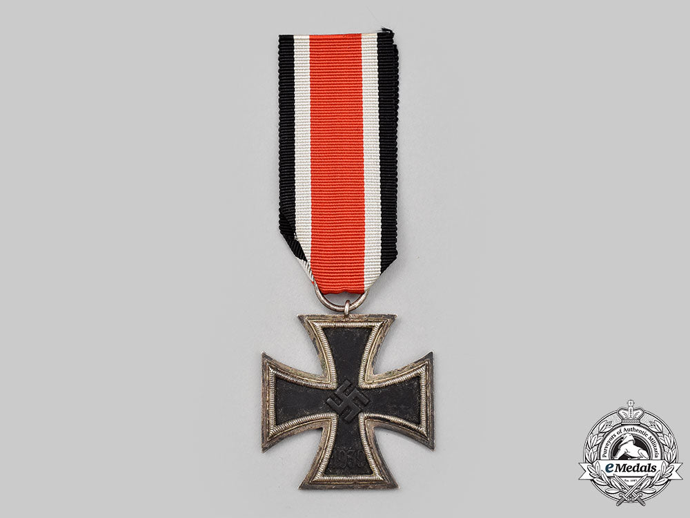 (Eisernes Kreuz 1939 II. Klasse). Reinstituted 1 September 1939. (1939-1945 issue). Constructed of iron and silver, on loop for suspension from its period original ribbon, consisting of a Cross Pattée with a blackened magnetic iron core within a ribbed silver frame, the obverse with a central mobile swastika, the six o’clock arm with a reinstitution date of “1939”, the reverse six o’clock arm with an initial institution date of “1813”, unmarked, measuring 44.16 mm (w) x 48.05 mm (h), weighing 18.6 grams, with minor loss of finish visible to the core, in near mint condition.