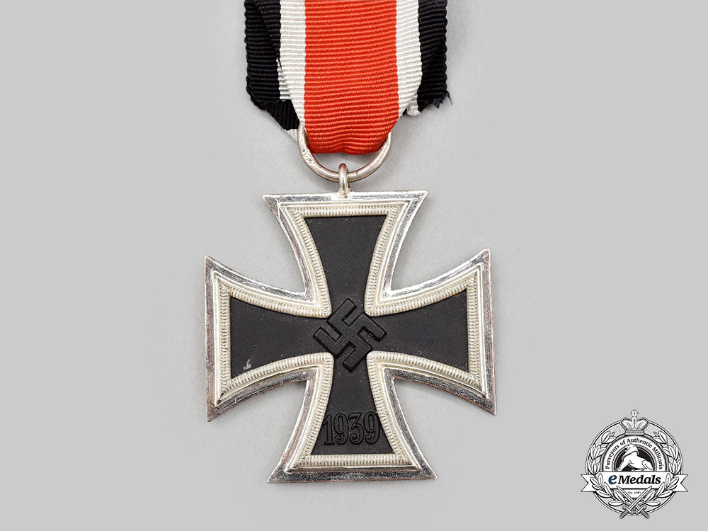 (Eisernes Kreuz 1939 II. Klasse). Reinstituted 1 September 1939. (1939-1945 issue). Constructed of iron and silver, on loop for suspension from its period original ribbon, consisting of a Cross Pattée with a blackened magnetic iron core within a ribbed silver frame, the obverse with a central mobile swastika, the six o’clock arm with a reinstitution date of “1939”, the reverse six o’clock arm with an initial institution date of “1813”, the suspension loop maker marked with LDO code “L/11” for Wilhelm Deumer, Lüdenscheid, measuring 43.65 mm (w) x 48.33 mm (h), weighing 18.9 grams, in near mint condition.