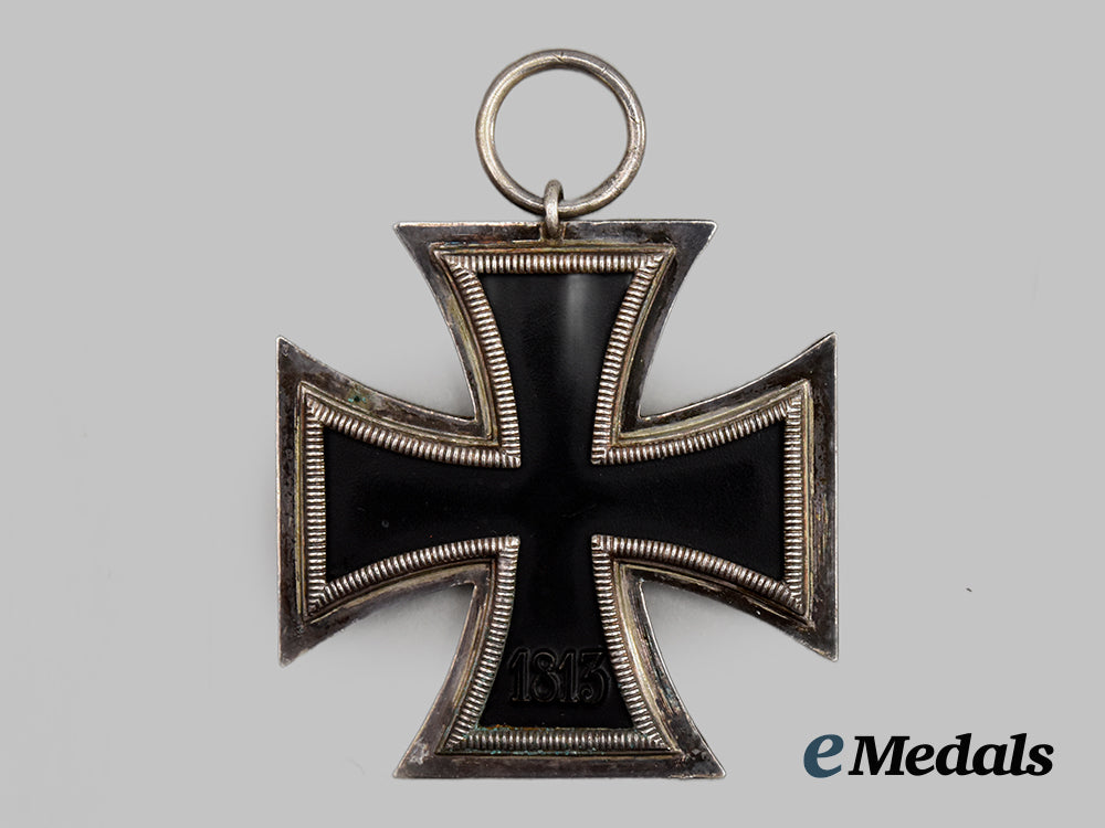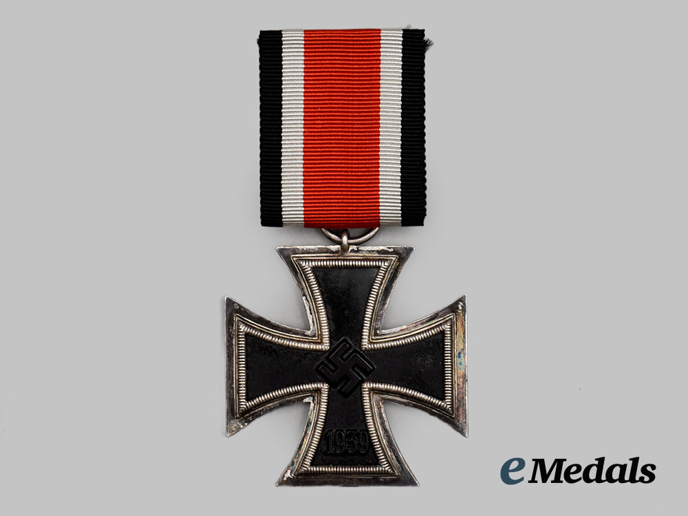 (Eisernes Kreuz 1939 II. Klasse, Übergröße). Reinstituted 1 September 1939. (1939-1945 issue). Constructed of iron and silver, on loop for suspension from its period original ribbon, consisting of a Cross Pattée with a blackened magnetic iron core within a ribbed silver frame, the obverse with a central mobile swastika, the six o’clock arm with a reinstitution date of “1939”, the reverse six o’clock arm with an initial institution date of “1813”, unmarked but demonstrating the characteristics of an Übergröße variant produced by Frank & Reif, Stuttgart, measuring 47.05 mm (w) x 50.26 mm (h), weighing 23.9 grams, a rare example in extremely fine condition.