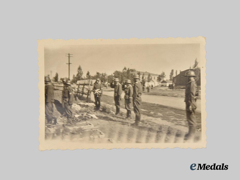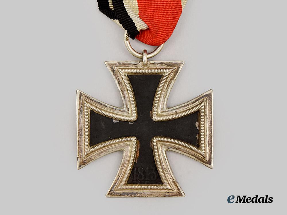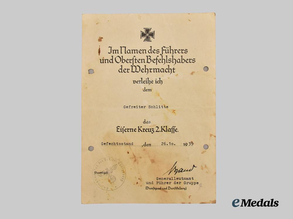 (Eisernes Kreuz 1939 II. Klasse mit Verleihungsurkunde). Reinstituted 1 September 1939. (1939-1945 issue). Constructed of iron and silver, on loop for suspension from its period original ribbon, consisting of a Cross Pattée with a blackened magnetic iron core within a ribbed silver frame, the obverse with a central mobile swastika, the six o’clock arm with a reinstitution date of “1939”, the reverse six o’clock arm with an initial institution date of “1813”, the suspension loop maker marked with Präsidialkanzlei code “24” for Arbeitsgemeinschaft der Hanauer Plakettenhersteller, measuring 44.77 mm (w) x 48.31 mm (h), weighing 20.1 grams, in near extremely fine condition, accompanied by its original award document, named to “GEFREITER SCHLITTE”, issued from headquarters on 26 October 1939, certified by the handwritten signature of Generalleutnant Albrecht Brand in his capacity as commander of the fortress of the city of Königsberg, measuring 13.5 cm (w) x 19.5 cm (h), demonstrating soiling throughout in addition to four punched eyelets consistent with previous binder storage, in very fine condition, also accompanied by a period photograph depicting a group of Luftwaffe Enlisted- and NCO-ranked soldiers wearing Stahlhelme at what appears to be a funeral in the field, unmarked, measuring 9 cm (w) x 6 cm (h), in extremely fine condition.