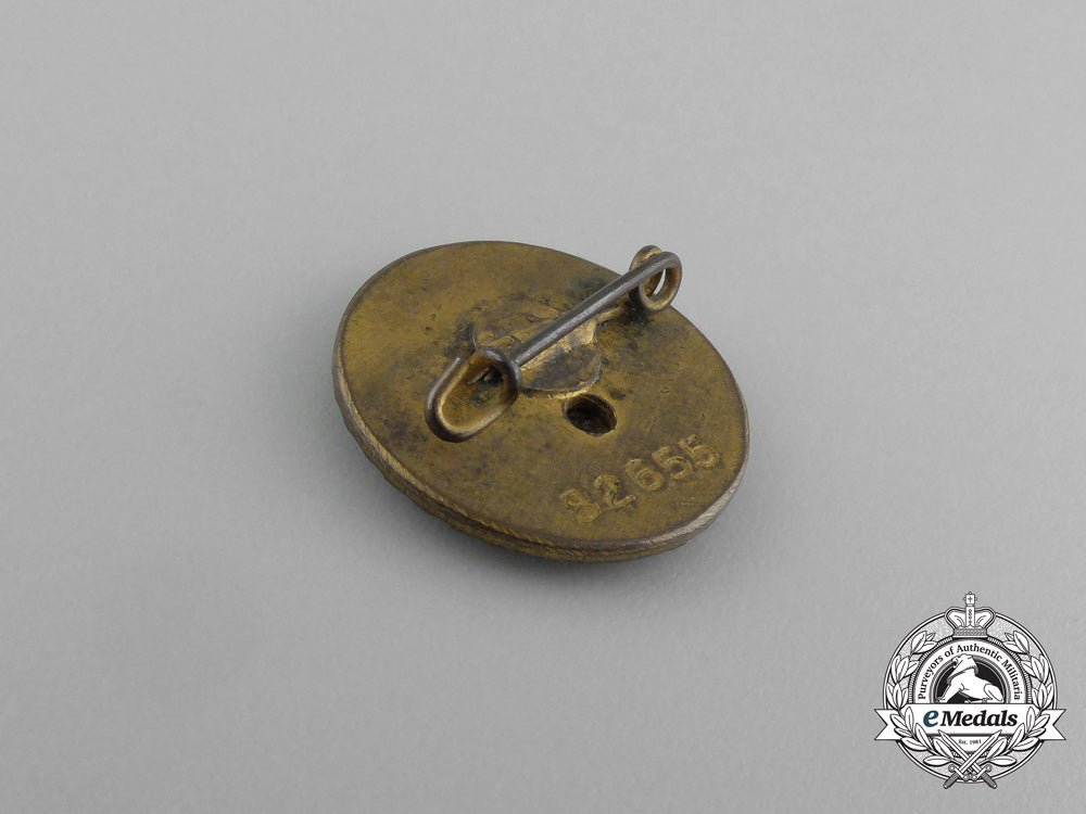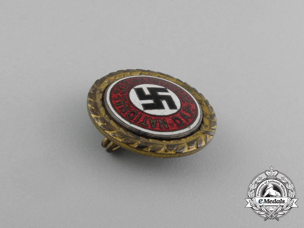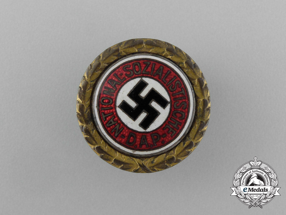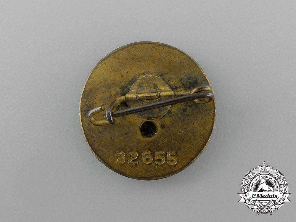 Small Golden Party Badge in gilded bronze and enamels, measuring 23. 63 mm, numbered “82655”, marked “Ges.Gesch.”, worn, very fine