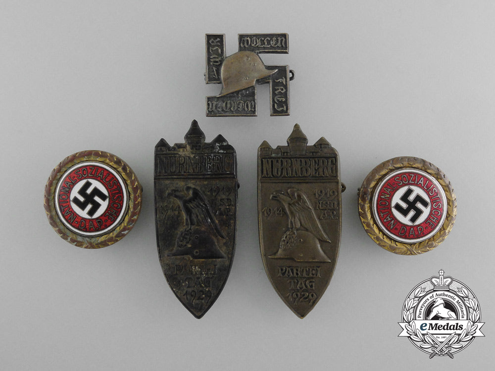 A lot of five NSDAP awards, coming recently from the German household as a group, including: Golden Party Badge with date of issue, in gilded tombac and enamels, 23.75mm (small version), reverse stamped "A.H. 22.12.38", slightly worn, no chipping to enamels, better then very fine condiiton; small golden party badge, 23.9mm, reverse stamped "33836", slightly worn, no chipping to enamels, extremely fine condition; Frntbann Badge, solid version, in silvered tombac, reverse top numbered "21", also marked "Ges. Gesch." and "RZM", 20.7mm x 20.6mm; two Nürnberger Party Rally badges, both hollow version. An un-researched lot of awards.