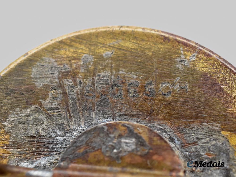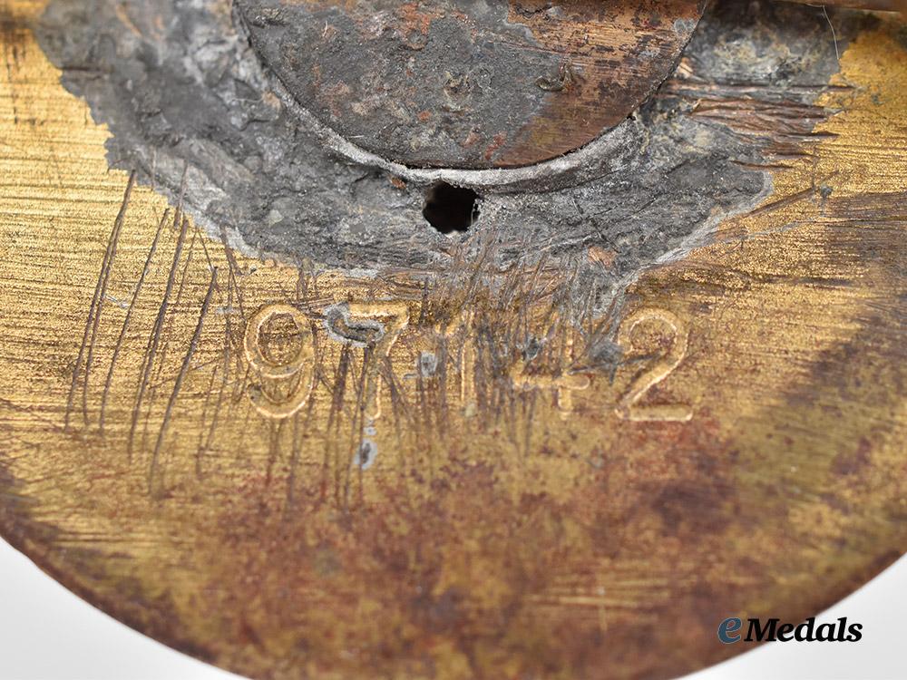 (Goldenes Ehrenzeichen der NSDAP). Constructed of gilded tombak with multi-coloured enamels, the obverse consisting of a circular oak leaf wreath, joined together at the bottom by ribbon, surrounding a white enameled disc bearing a central black mobile swastika, in turn situated within a red enameled ring bearing a gilt inscription of “NATIONAL-SOZIALISTISCHE D.A.P.”, then reverse with a horizontal pinback, stamped with an issue number of “97142”, otherwise unmarked but demonstrating the characteristics of manufacture by Deschler & Sohn, Munich, measuring 30.48 mm in diameter, weighing 12.2 grams, demonstrating flecking and scratching to the enamels with loss of finish throughout the base metal, in addition to period repair or re-attachment of the pinback, in very fine condition.