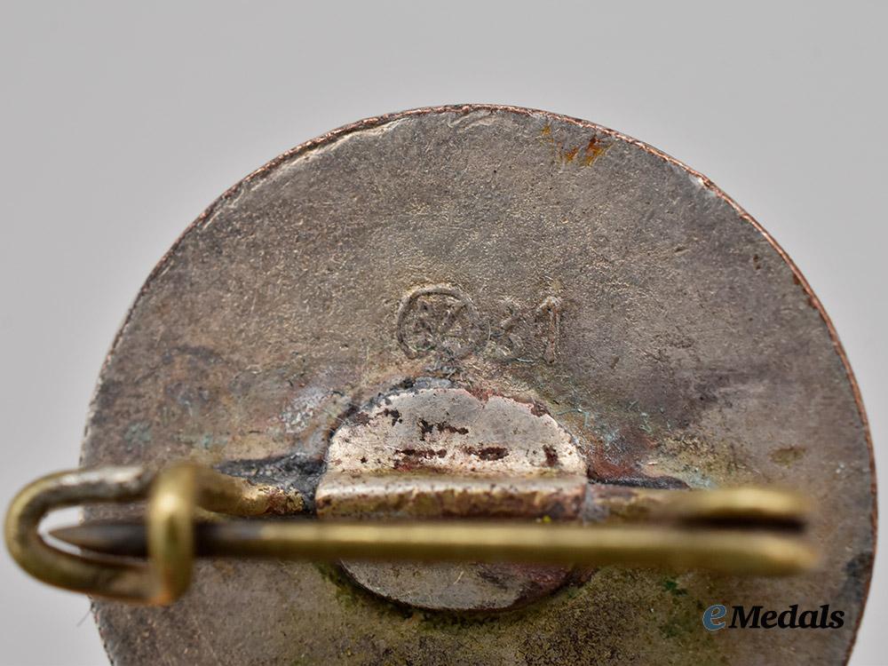 (NSDAP Mitgliedsabzeichen Miniatur). Constructed of silvered bronze with multi-coloured enamels, horizontal pinback, the reverse marked with a Reichszeugmeisterei (RZM) logo and maker code “31” for Karl Pfohl, Pforzheim, measuring 19 mm in diameter, demonstrating minor flecking to the enamels, a scarce miniature version produced by a manufacturer whose production was limited due to the revocation of their RZM certification, in extremely fine condition.