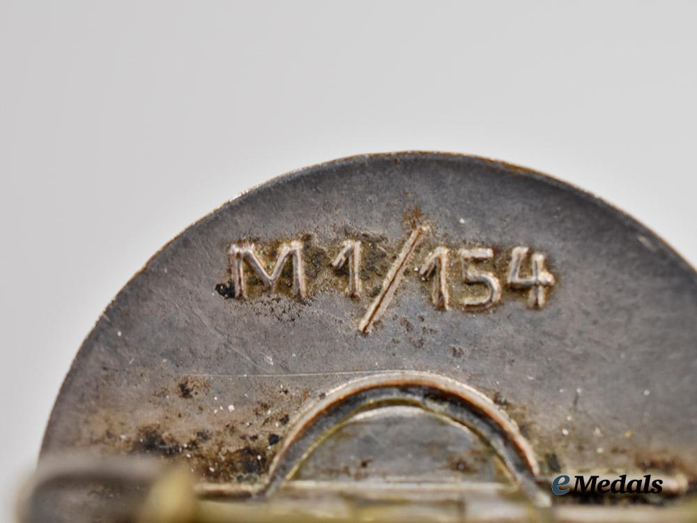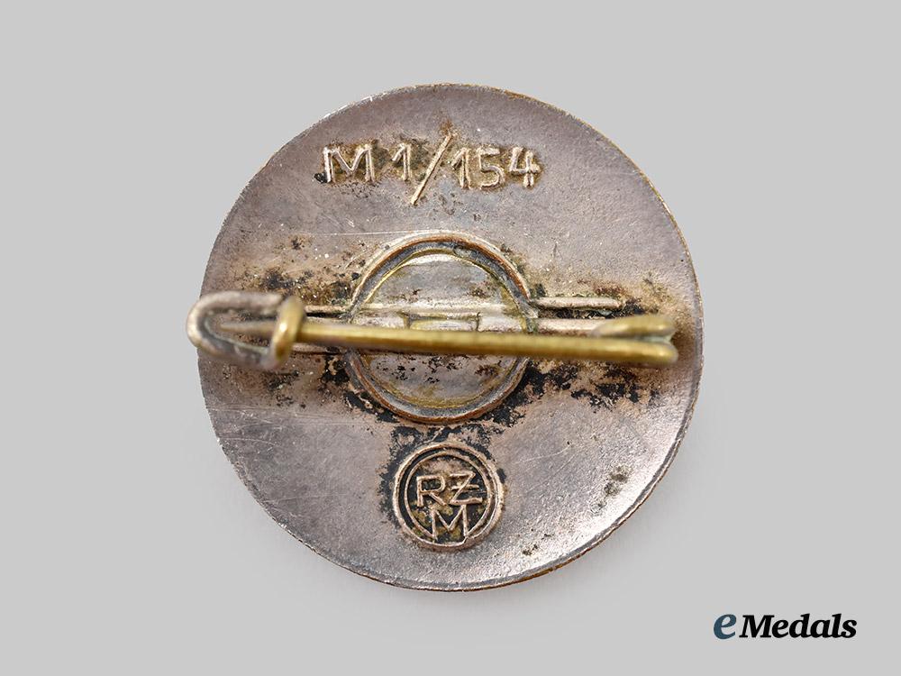 (Mitgliedsabzeichen der NSDAP). Constructed of silvered bronze with multi-coloured enamels, horizontal pinback, the reverse marked with a Reichszeugmeisterei (RZM) logo and maker code “M1/154” for a documented but unidentified manufacturer, measuring 24 mm in diameter, a rare example in extremely fine condition.