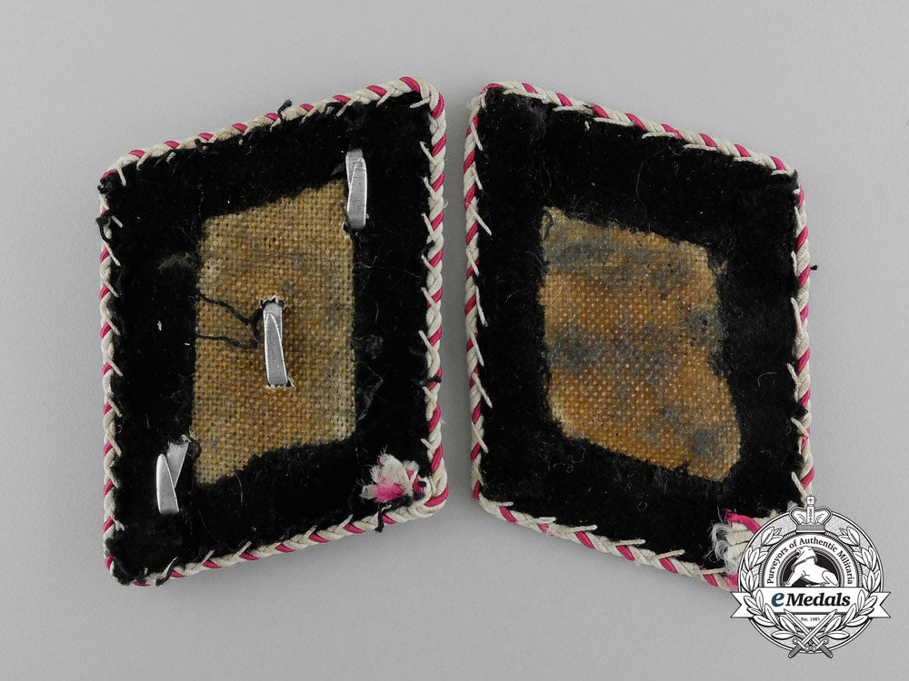Footnote: edging on the tabs is not according to regulations; however, this twisted rayon waffenfarbe appears to be period and profesionally stitched to the tab. A well known collector and authority on the subject D. Delic shed some light on this pair, suggesting: "likely the original owner spruced up his tabs with the only piping he had access to that was similar in color to the secondary piping on his shoulderstraps. He may have felt the overall appearance of the insignia was more balanced that way! Unless he was adept with needle and thread, he had it professionally done. "