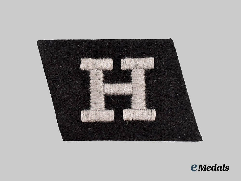 (Waffen-SS Kragenspiegel für Mannschaften der 25. Waffen-Grenadierdivision der SS “Hunyadi” (ungarische Nr. 1)). Constructed of black wool with a buckram core, the obverse bearing a machine-embroidered silver-grey letter “H”, the reverse demonstrating silver-grey machine stitching along all four edges, unmarked, measuring 40 mm (w) x 55 mm (l), the reverse demonstrating the remnants of an adhesive consistent with previous display, a classic Dachau-style tab in extremely fine condition.