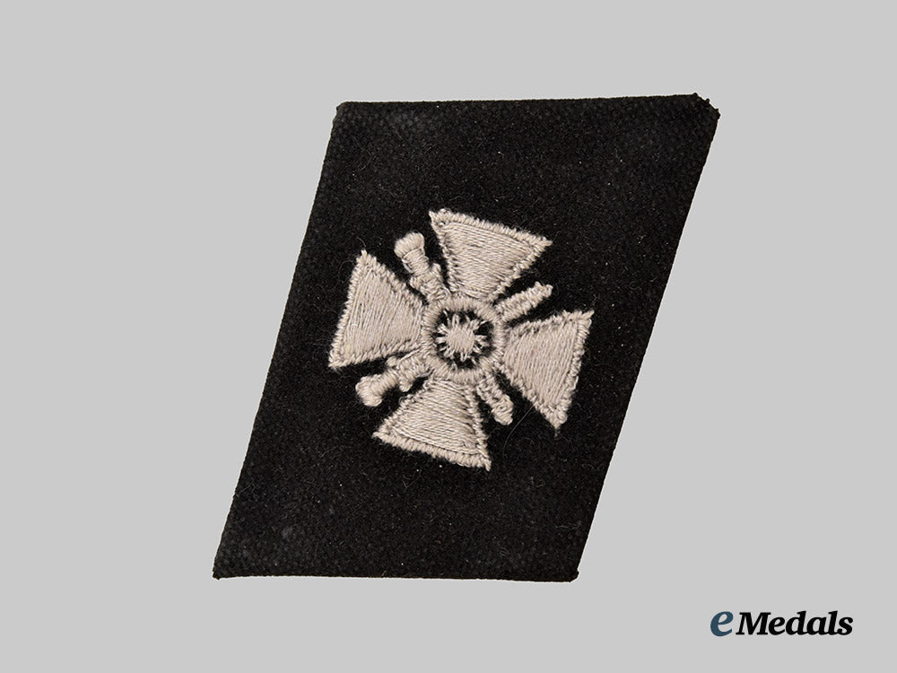 (Waffen-SS Kragenspiegel für Mannschaften der 29. Waffen-Grenadier-Division der SS „RONA“ (russische Nr. 1)). Constructed of black wool with a buckram core, the obverse bearing a machine-embroidered Cross Pattée with crossed swords piercing the centrepiece, unmarked, measuring 40 mm (w) x 55 mm (l), the reverse demonstrating the remnants of an adhesive consistent with previous display, the stitching has loosened from two ends, a Dachau-made example in very fine condition.