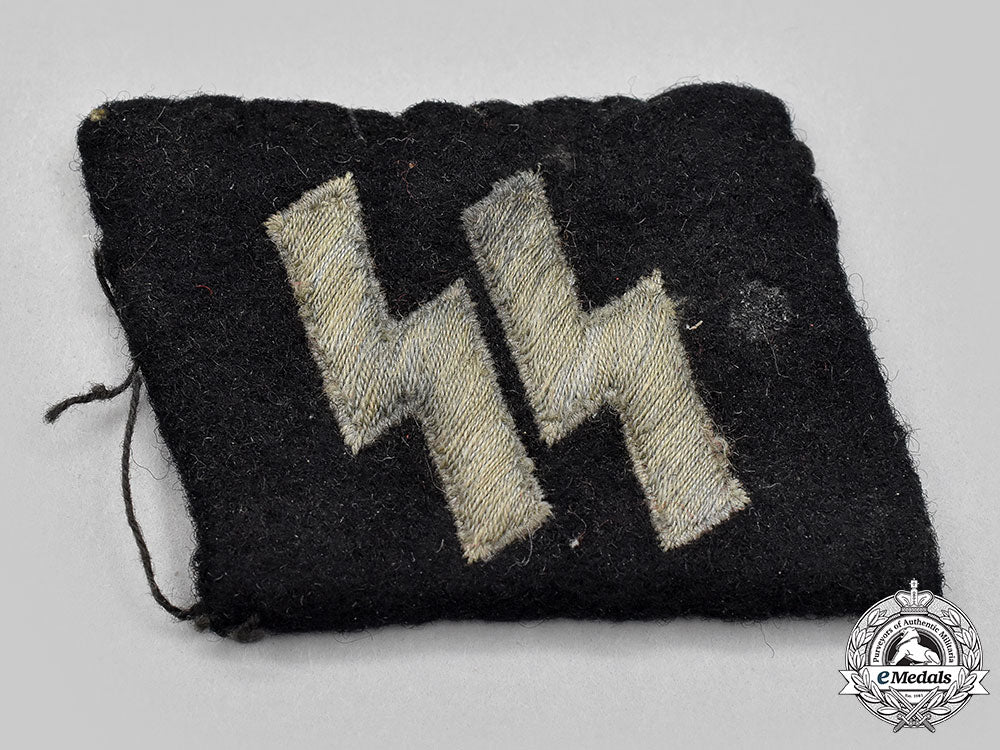 (Waffen-SS Kragenspiegel). Constructed of black wool with a buckram core, the obverse bearing machine-embroidered silver-grey double Sig runes, the reverse retaining a mostly intact Reichszeugmeisterei (RZM) label bearing an illegible maker’s code, measuring 40 mm (w) x 50 mm (l), demonstrating soiling and material fatigue consistent with field use, in uniform-removed and very fine condition.