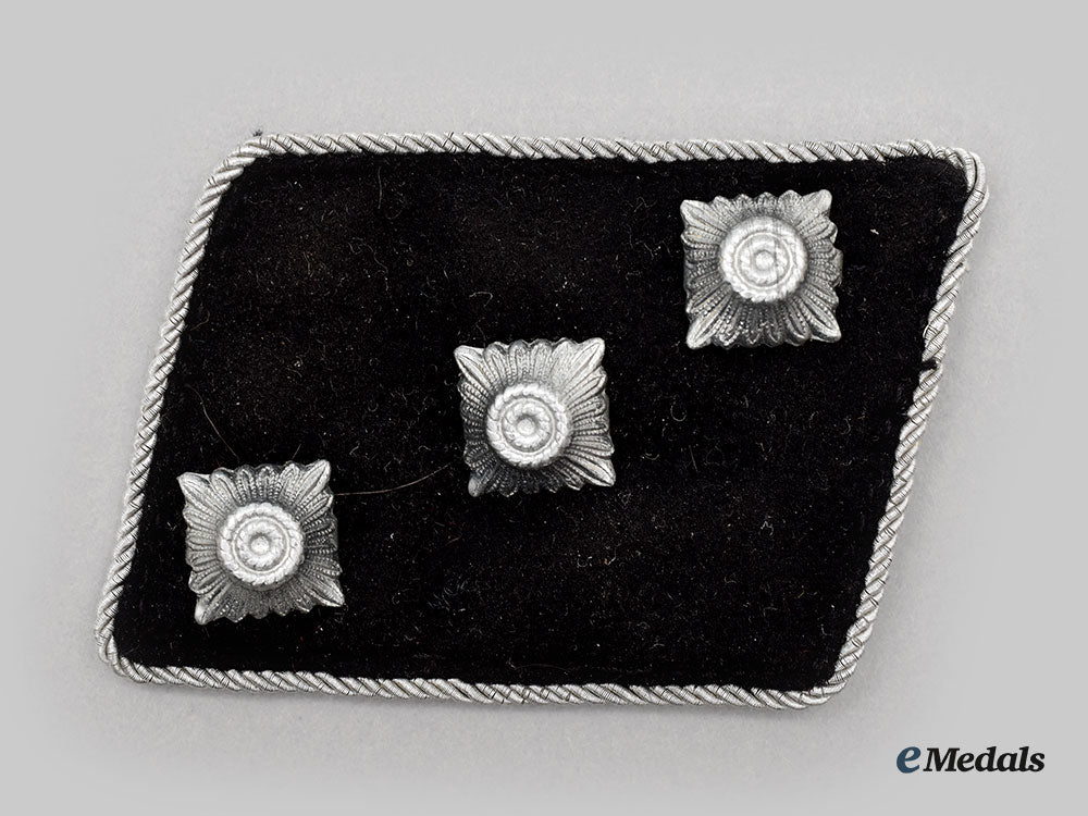(Waffen-SS Kragenspiegel für Untersturmführer). Constructed of black wool with a buckram core, trimmed with twisted and rolled silver aluminum wire piping, and pinned with three aluminum rank pips, unmarked, measuring 42 mm (w) x 55 mm (l), in e Sturmbann Nürnberg Officer’s Collar Tab.
