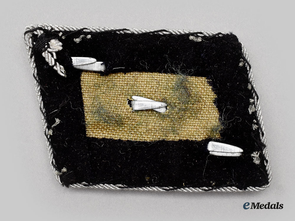 (SS-Verfügungstruppe Kragenspiegel für Offizier). Constructed of black wool, trimmed with black threaded and silver aluminum wire piping, the obverse bearing dual hand-embroidered silver aluminum wire Sig runes flanked by a stylized letter “N” for Nürnberg (Nuremberg), unmarked, measuring 45 mm (w) x 55 mm (l), demonstrating minor material fatigue to the obverse wool, a scarce insignia in near extremely fine condition.