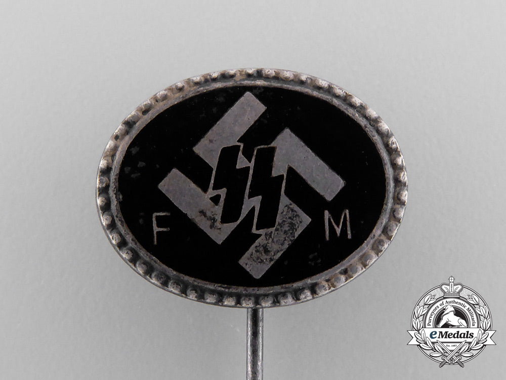 Footnote: A “Förderndes Mitglied der SS was an individual who did not formally join the Waffen-SS for active duty, but instead contributed financially to the organization on a monthly basis towards the work of the SS at their local SS headquarters. The SS-FM was organized by the SS Wirtschafts und Verwaltungshauptamt (SS Economic and Administrative Department). Each member was issued a lapel pin, a supporters I.D card, a contribution book, and starting 1934, members also received a monthly magazine, entitled FM-Zeitschrift, which was issued by the SS High Command.