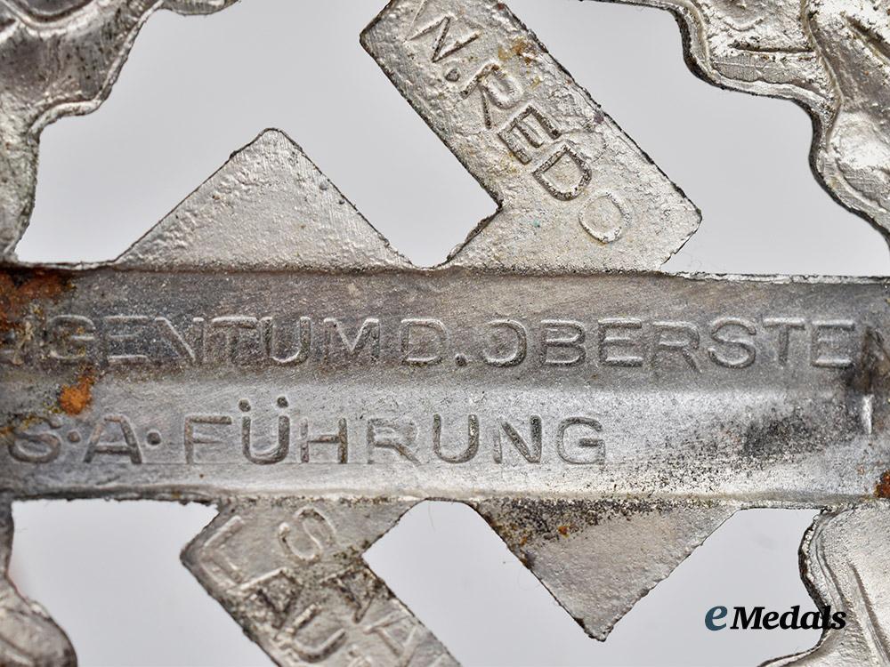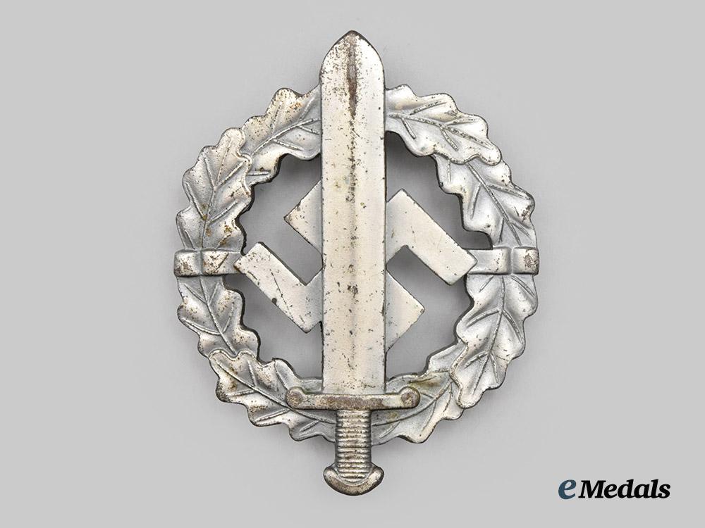 (SA-Sportabzeichen in Silber). Instituted November 28th, 1933. Constructed of silvered magnetic metal, the obverse consists of a circular oak wreath, overlaid by a sword on-top of a mobile swastika, the reverse with an integral hinge, vertical pinback, and flat wire catch, maker marked “W. Redo, Saar-Lautern” on the reverse, measuring 46.5 mm (w) x 58.7 mm (l), weighing 17.82, with nearly all of its original silver finish remaining, in near mint condition.