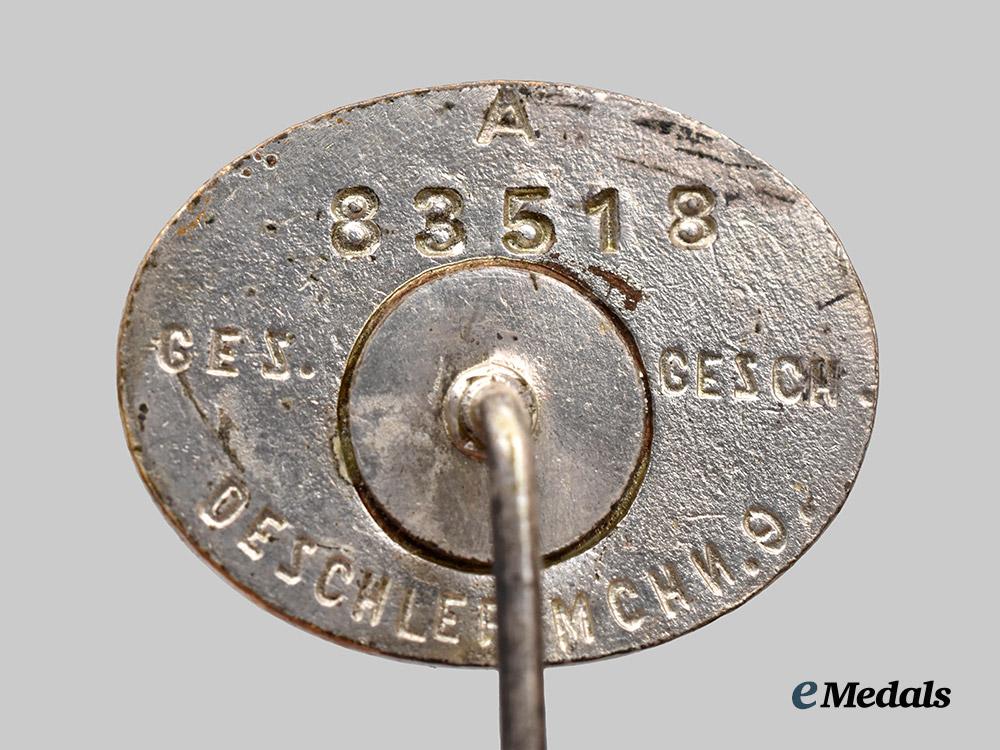 (SS Fördernde Mitglieder Anstecknadel). Constructed of silvered bronze with enamels, the obverse consisting of a black enameled oval within a pebbled border, with a central mobile swastika overlaid by double Sig runes, flanked by initials “FM”, the original reverse issue number has been coated out and engraved with a number of “A83515”, above a maker’s mark of “DESCHLER, MCHN”, measuring 19.43 mm (w) x 15.00 mm (h), weighing 3.2 grams, demonstrating minor flecking and loss of finish to the enamels and base metal, respectively, in extremely fine condition.