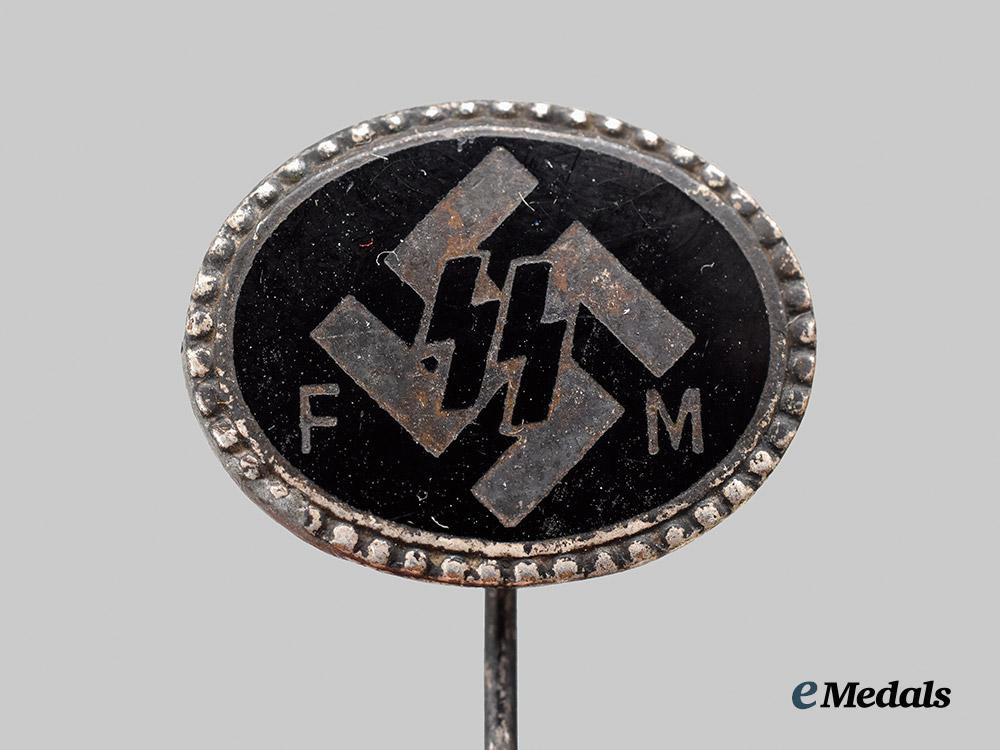 (SS Anstecknadel). Constructed of silvered tombak with black enamels, the obverse consisting of a black enameled oval disc, within a pebbled border, around a central silvered mobile swastika overlaid by double Sig runes, flanked by silver initials “FM” for “Förderndes Mitglied” (“Supporting Member”), the reverse stamped with an illegible identification number beginning with a “K” prefix, maker marked “DESCHLER, MNCHN”, measuring 19.48 mm (w) x 15.18 mm (h), weighing 3.4 grams, the needle has been repaired or re-attached with solder, with additional loss of finish visible to the metal base, in very fine condition.