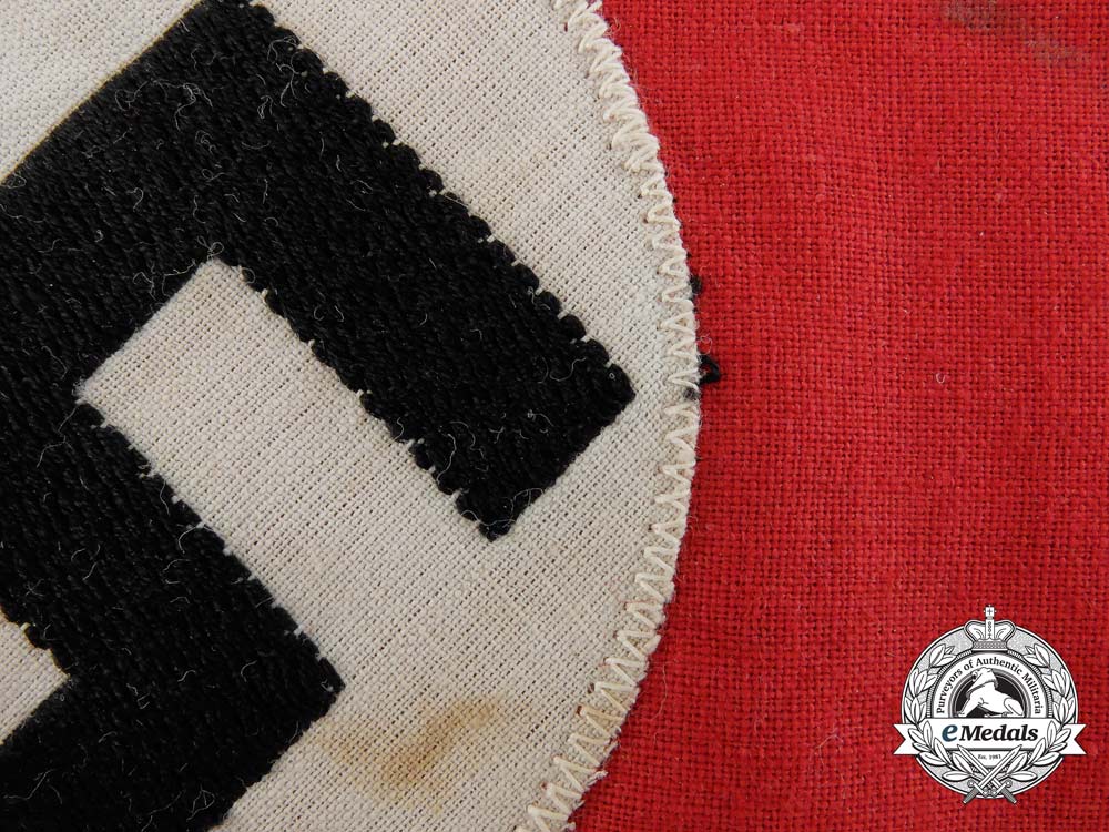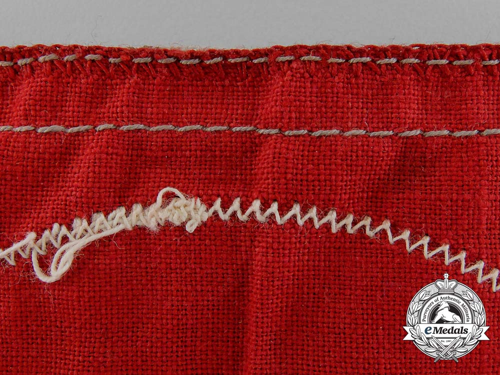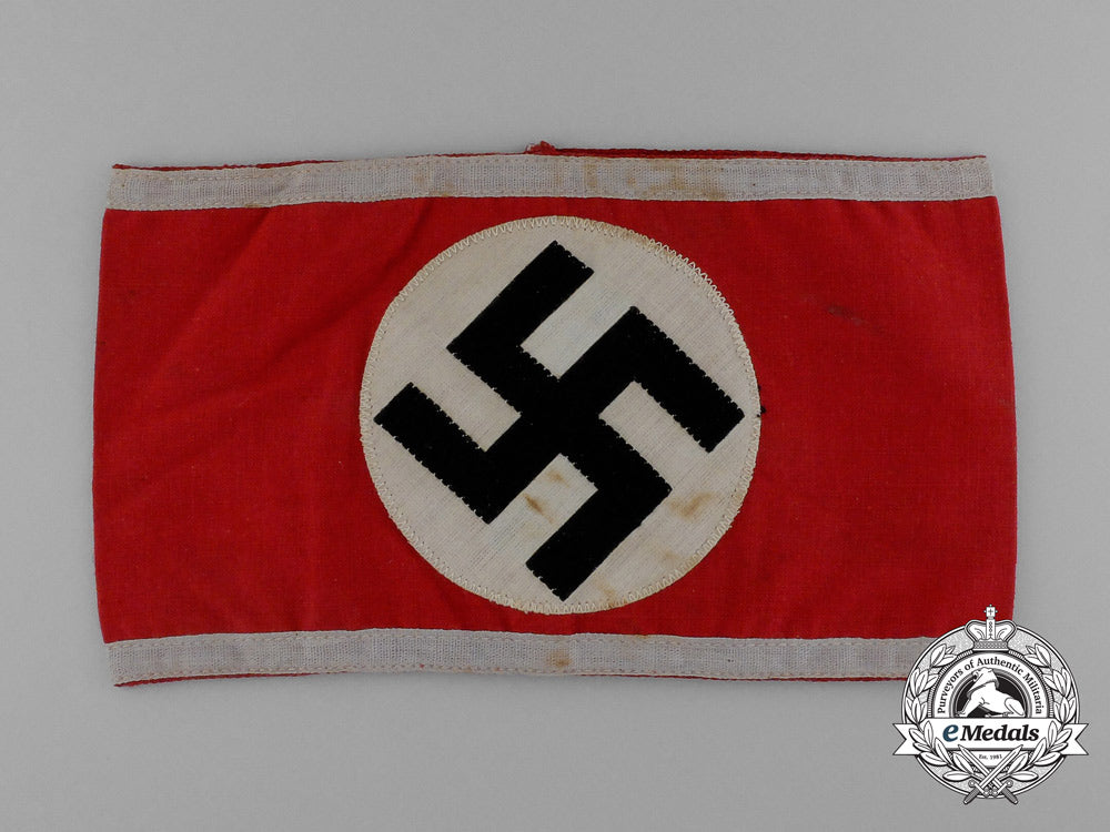 Four piece construction; black embroidered swastika on a 88 mm white rayon roundel; on a red rayon armabd; with 9 mm white rayon strips on the top and bottom edges; measuring 204 mm x 113 (folded); lightly soiled from period use but overall very fine condition.