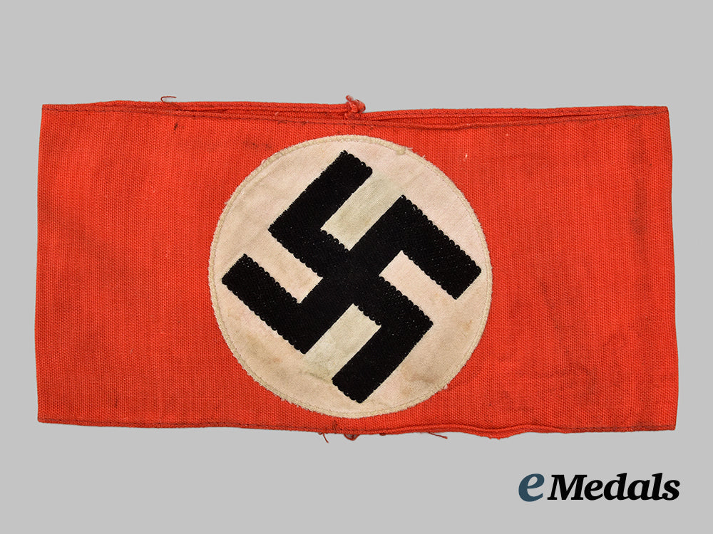 (NSDAP Armband). Constructed of a red cotton/rayon-blended material, the exterior bearing a white cotton/rayon disc overlaid by a machine-embroidered black mobile swastika, unmarked, measuring 20 cm (w) x 10 cm (h) when folded on a flat surface, demonstrating minor soiling, in near extremely fine condition.
