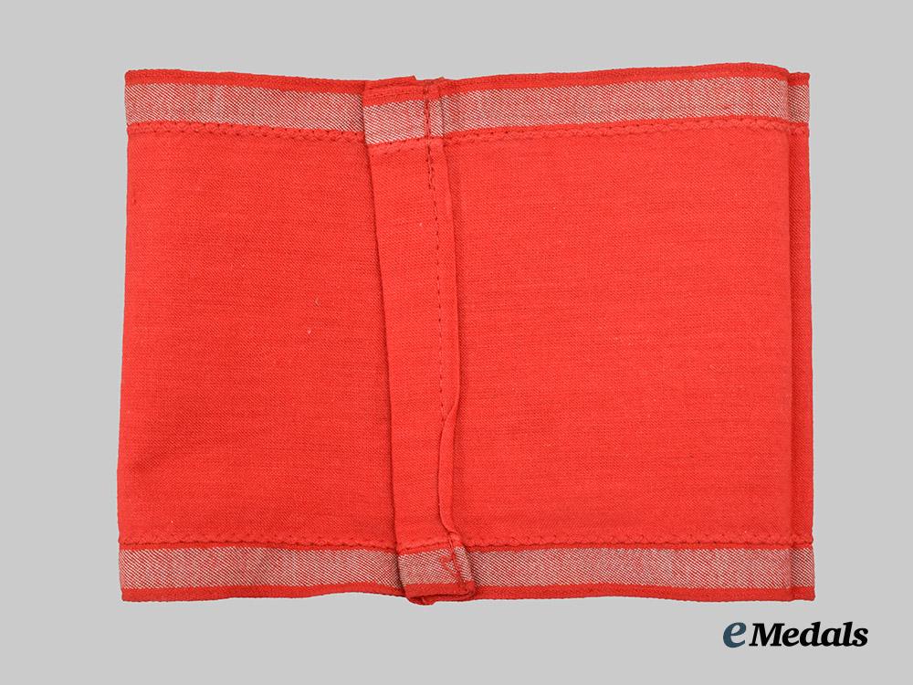 (Armbinde für das Braunhemd der SA-Ersatzreserve). Constructed of red cotton, the exterior trimmed along both the top and bottom edges with silver-grey embroidered tresses, bearing a central machine-embroidered white disc measuring 8.5 cm in diameter, in turn overlaid by a black mobile swastika, unmarked, measuring 12.5 cm (h) x 18 cm (l) when folded on a flat surface, demonstrating only minor and sporadic soiling, a rare example in extremely fine condition.