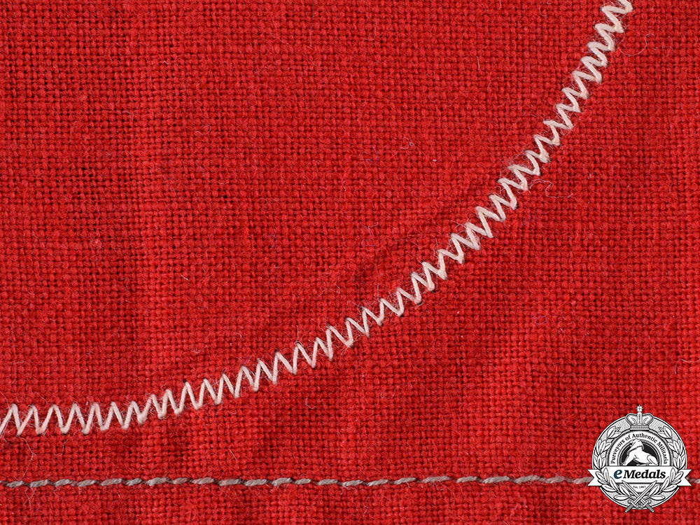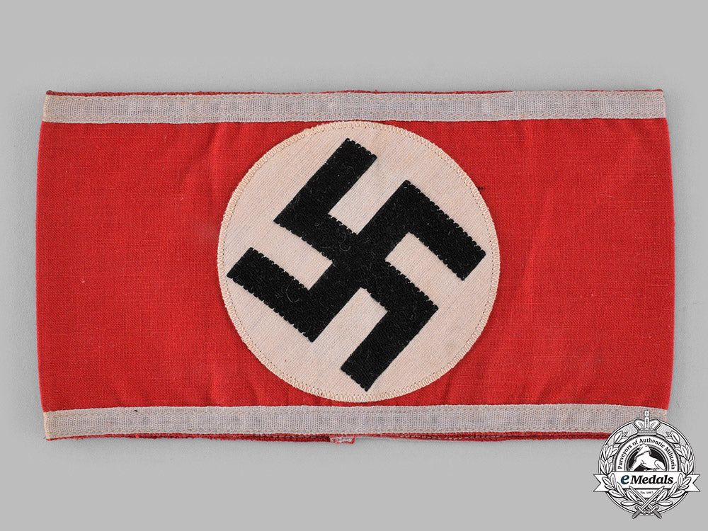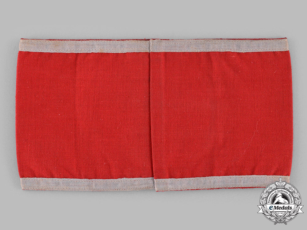 (Reserve-Sturmabteilung Armband). A rare Sturmabteilung (SA) Reserve armband, constructed of red cotton twill, the exterior trimmed with dual white cotton tresses, with a central white disk bearing a black machine-embroidered mobile swastika, unmarked, measuring 200 mm (w) x 108 mm (h), in extremely fine condition.