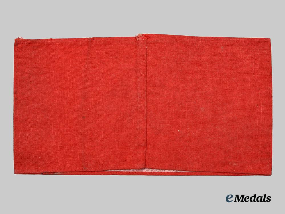 (NSDAP Armband). Constructed of a red cotton/rayon blended material, the obverse depicting a white roundel with a black mobile swastika in the center, the armband is sewn together on the reverse, unmarked, measuring 218 mm (w) x 114 mm (l), in very fine condition.