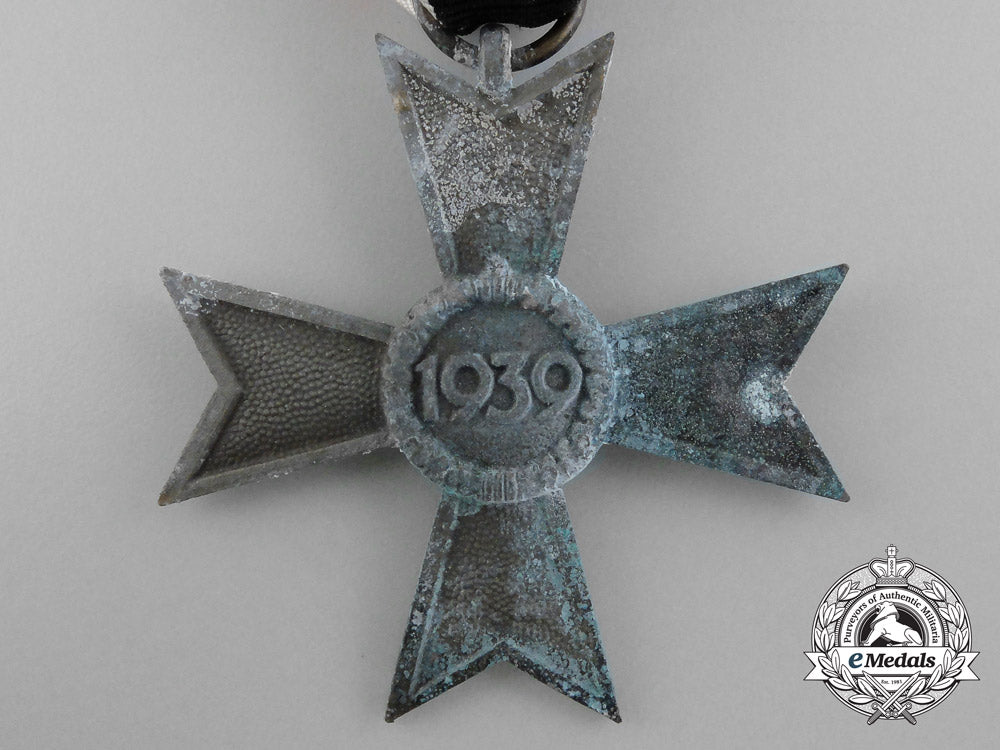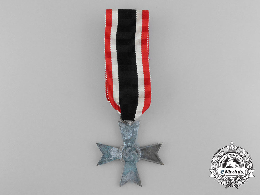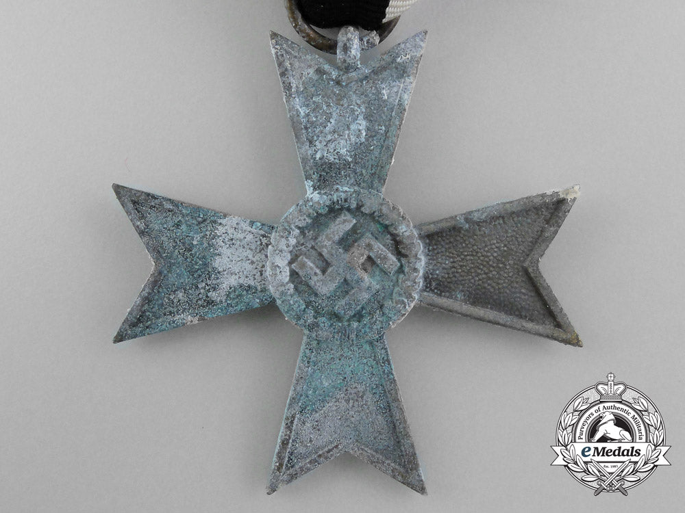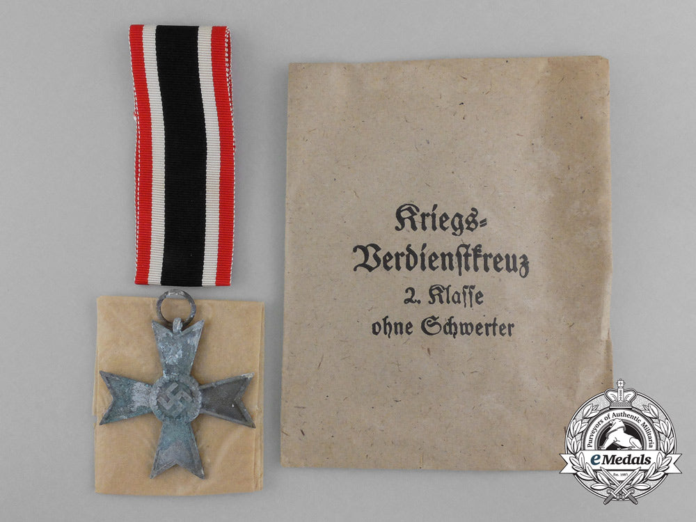 A Kriegsverdienstkreuz 2. Klasse ohne Schwerter; crafted in bronze; with original mint and unworn ribbon, packet of issue, and original wrapping paper; ribbon is vertically striped in red-white-black-white-red; cross measures 48 mm x 48 mm; in fair condition due to heavy corrosion from age alone - not wear. Paper packet of issue with “Kriegsverdienstkreuz 2. Klasse ohne Schwerter” printed in black in on the obverse, with the maker mark cut out on the reverse; measuring 128 mm x 103 mm; near mint condition.