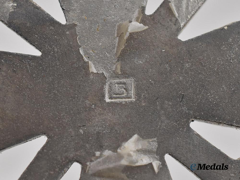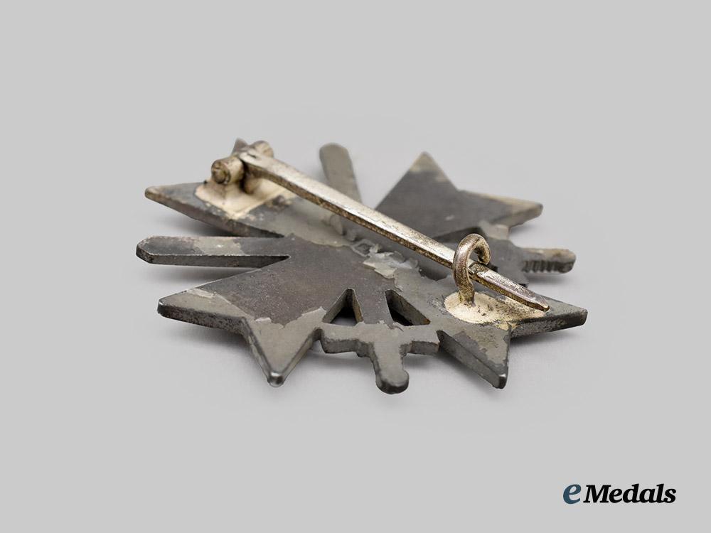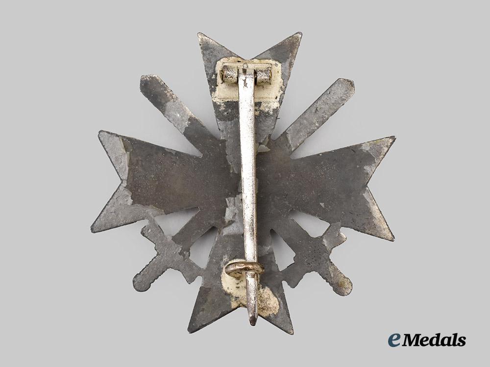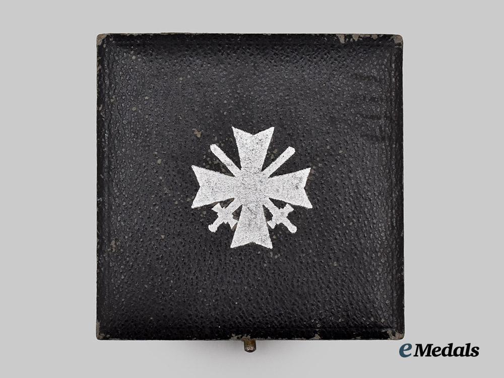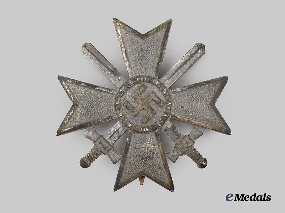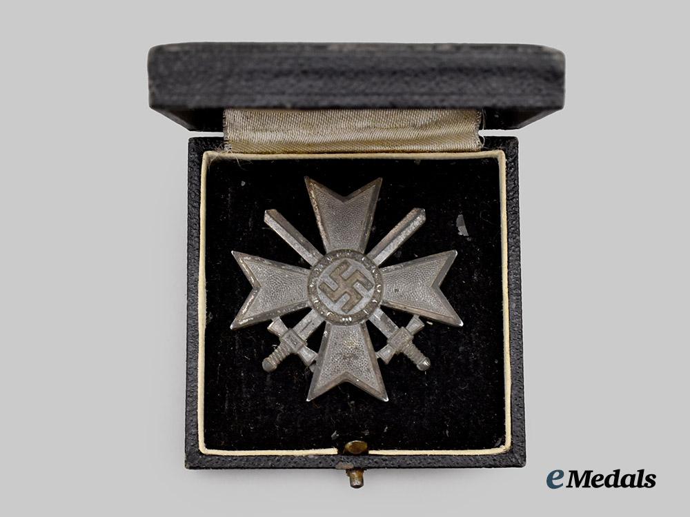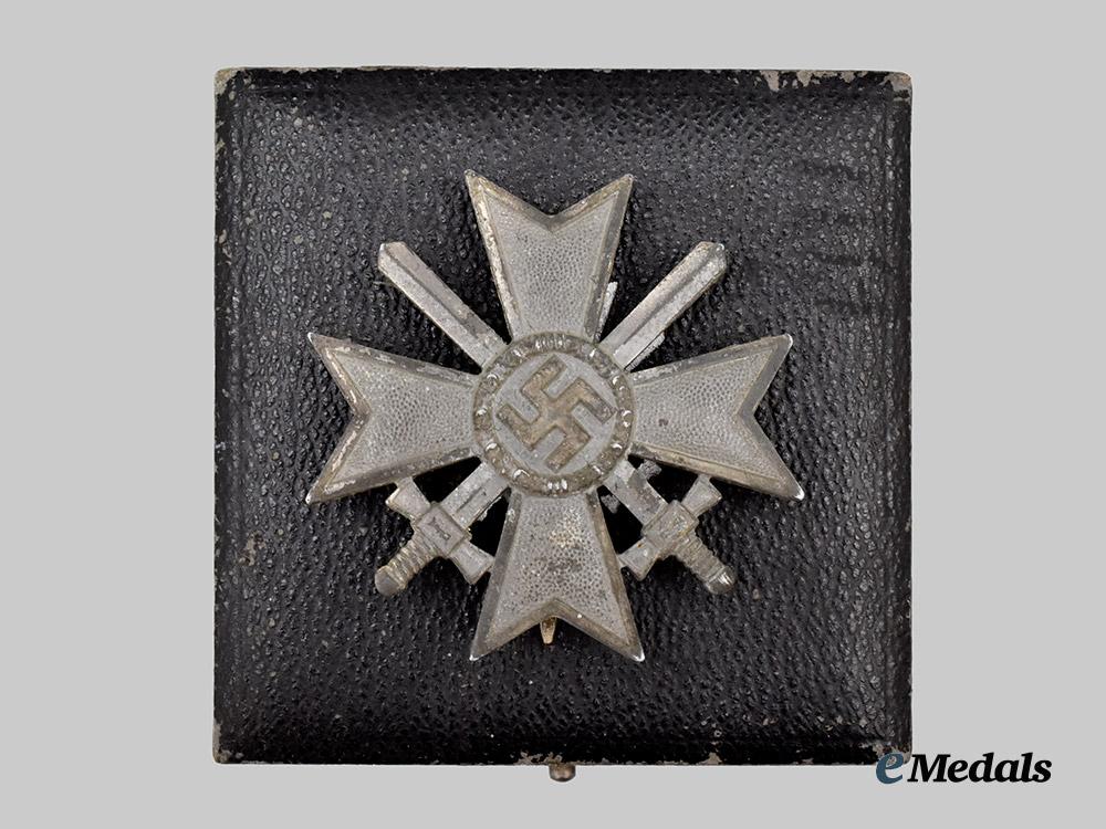(Kriegsverdienstkreuz I. Klasse mit Schwertern und Etui). Constructed of silvered zink, consisting of a Cross Pattée with crossed swords piercing the centrepiece, the obverse with pebbled arms and a central wreathed mobile swastika, the reverse with a barrel hing and tapering vertical pinback meeting a round wire catch, maker marked with Präsidialkanzlei code “3” for Wilhelm Deumer, Lüdenscheid, measuring 47.30 mm (w) x 47.00 grams, weighing 18.0 grams, accompanied by its original presentation case, constructed of a card stock frame with a faux blackened leather exterior liner, the lid bearing a silvered depiction of the award, the interior with a white rayon lid liner and intact hinge cover, with a slotted black felt medal bed, closing with a functional metal spring catch with exterior stud release, unmarked, measuring 70 mm (w) x 70 mm (l) x 20 mm (h) demonstrating total loss of silver finish and minor oxidation throughout the cross, in very fine condition.